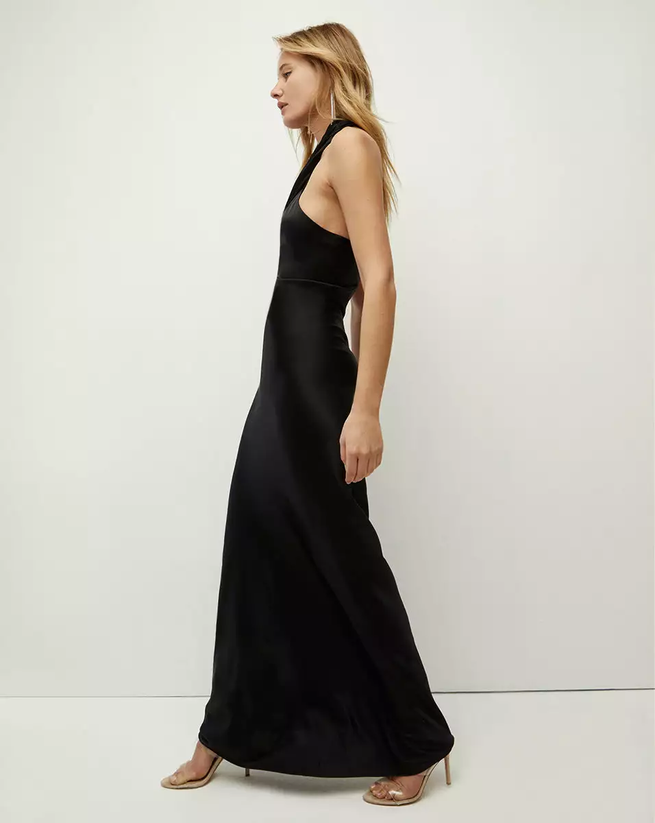 For the main event. Introducing the Alberta evening gown, the height of effortless elegance. It’s crafted from a luxury stretch-silk charmeuse that’s thoughtfully draped for the most flattering fit. The fluid fabrication also allows for ease of movement, while the crosscross neckline and fitted waistline creates a striking, feminine silhouette. A concealed back zip and full inner lining completes this RSVP-ready piece. Create a sleek look with strappy sandals and minimalist jewelry for your next big evening event.