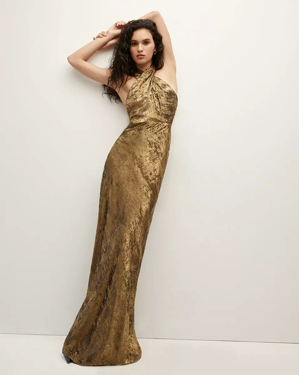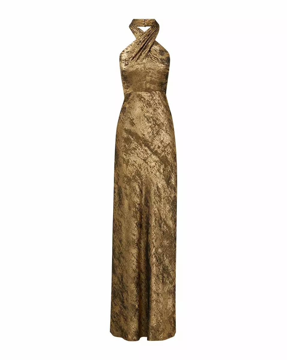 Made for the main event. Back again for another season and updated in a textured gold, the Alberta evening gown exudes effortless elegance. It’s cut from georgette with a sandwashed lamé finish and a subtle shimmer that’s thoughtfully draped for the most flattering fit. The fluid fabrication also allows for ease of movement, while the crisscross neckline and fitted waistline creates a striking, feminine silhouette. A concealed back zip and full inner lining completes this RSVP-ready piece. Finish the look with strappy sandals and statement earrings for your next big evening event.