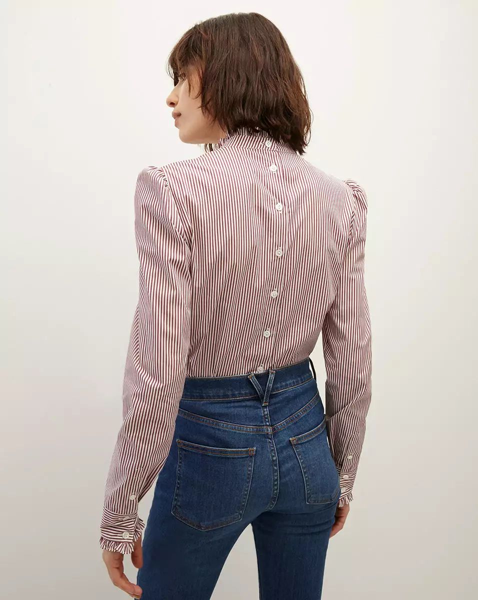 Every woman needs a trusted go-to top—the Alford is it. Expertly tailored from crisp cotton poplin, the wear-forever style features puffed sleeves and intricate ruffles at the mock neckline and sleeves. This feminine take on the simple long-sleeve shirt is both great on its own or as a layering essential. Pair with jeans and loafers to elevate the everyday; just add heels for night.
