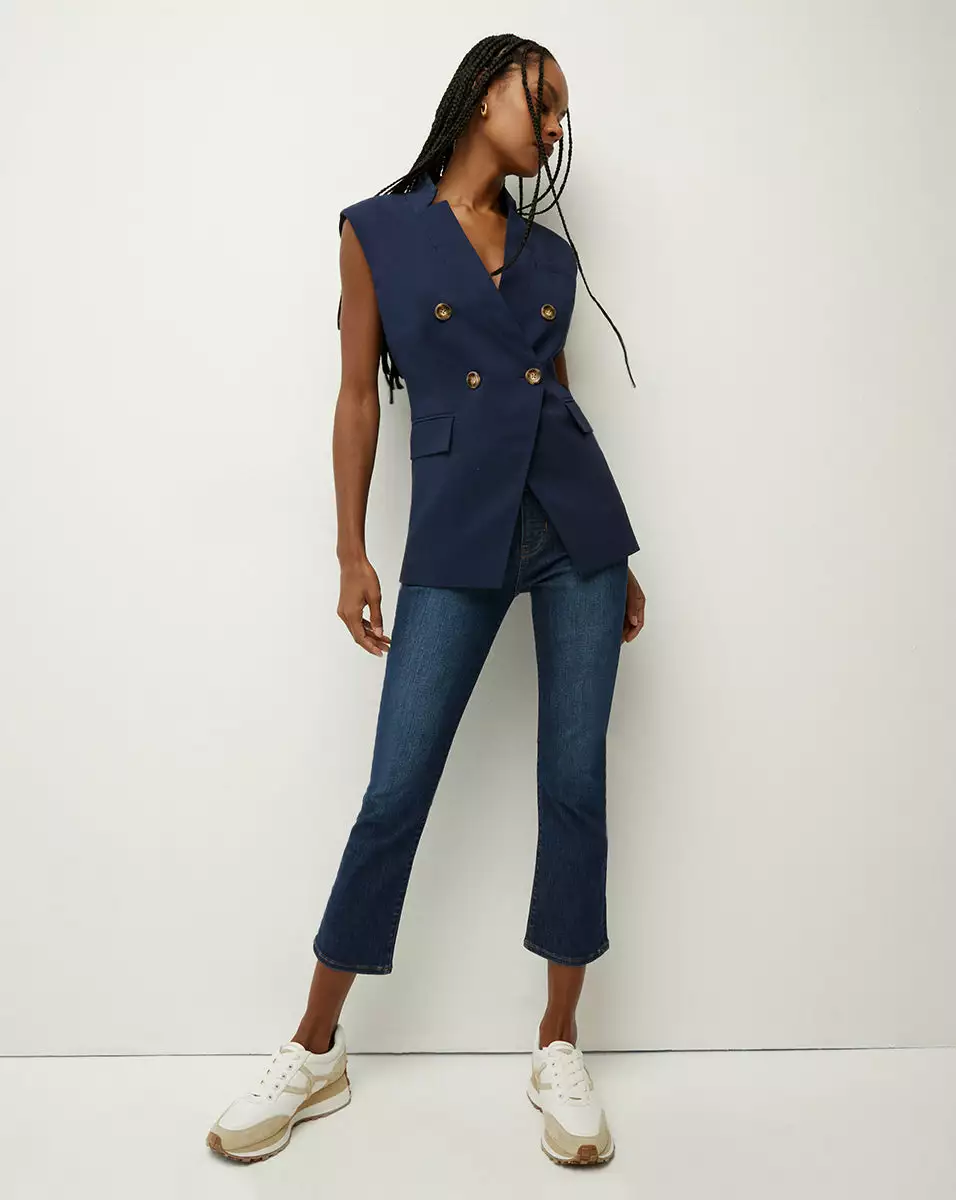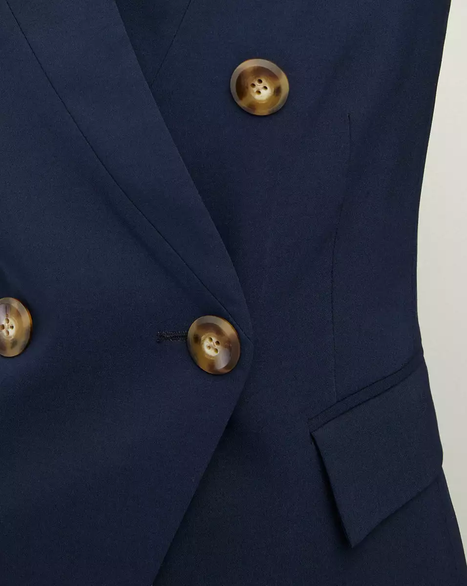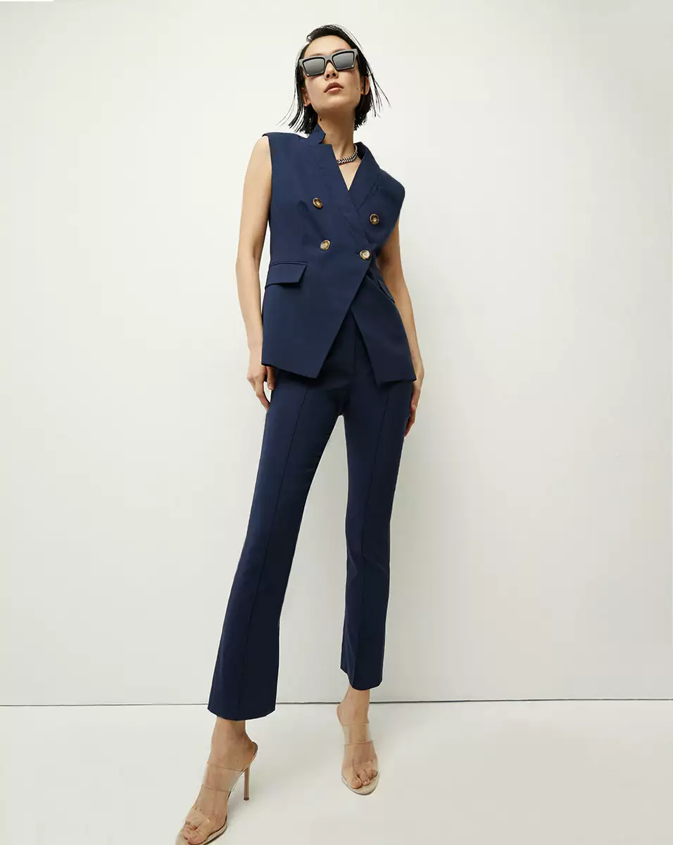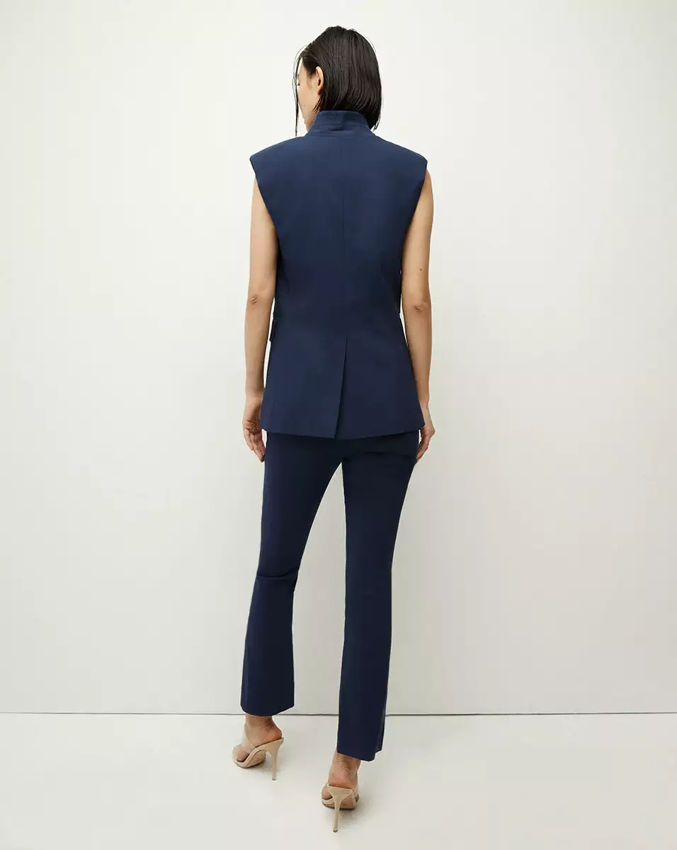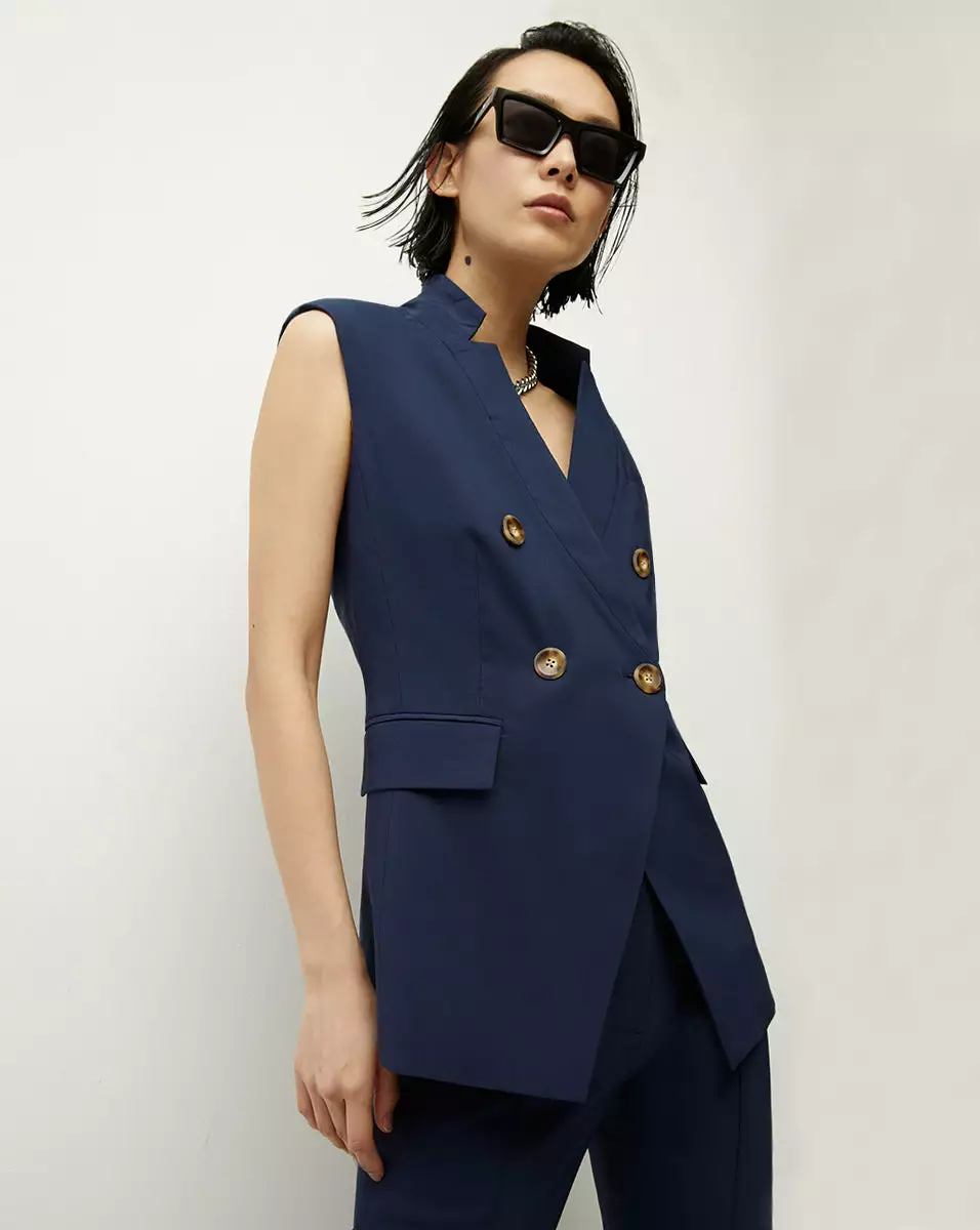 A VB favorite, the Amika is a cool take on a tailoring classic—complete with padded shoulders, a notched pop collar and tortoiseshell buttons. Crafted from premium modal with a high stretch factor, this double-breasted construction ensures instant polish while the vest silhouette adds a youthful spin. Pair with the coordinating pant for a high-impact matching-set moment.