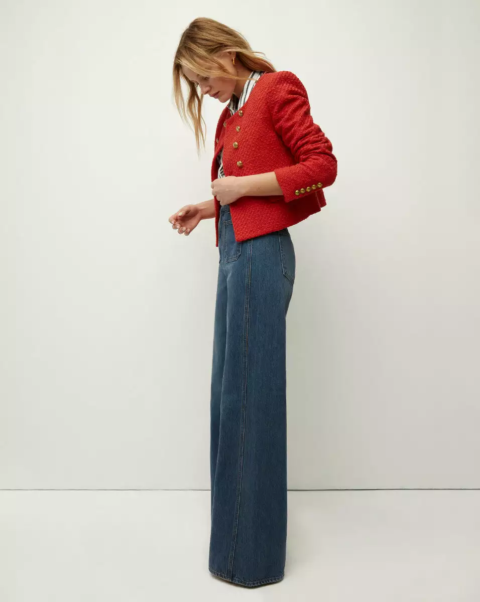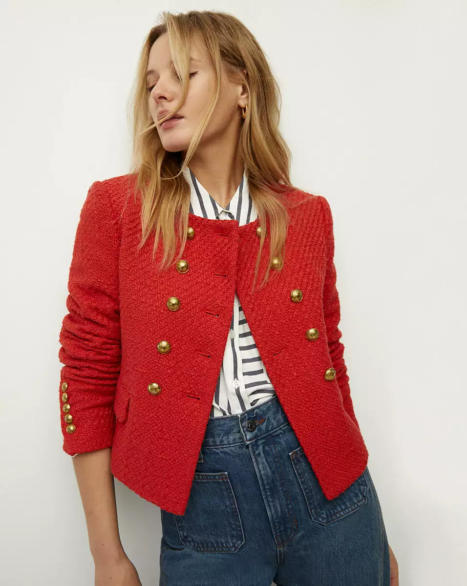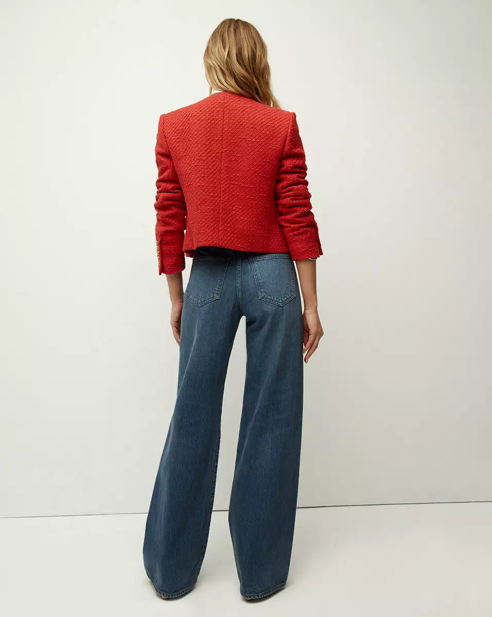 A great tweed jacket is a cornerstone of every wardrobe. We elevated ours with an elegant collarless design, domed gold buttons and a bold red hue. Exceptionally tailored from environmentally conscious BCI cotton, this boxy, ladylike silhouette also features a hint of stretch for ease. Flap pockets and rounded, padded shoulders complete the look. Pair with the coordinating skirt or, for a dose of downtown edge, wear with distressed jeans and strappy heels.
