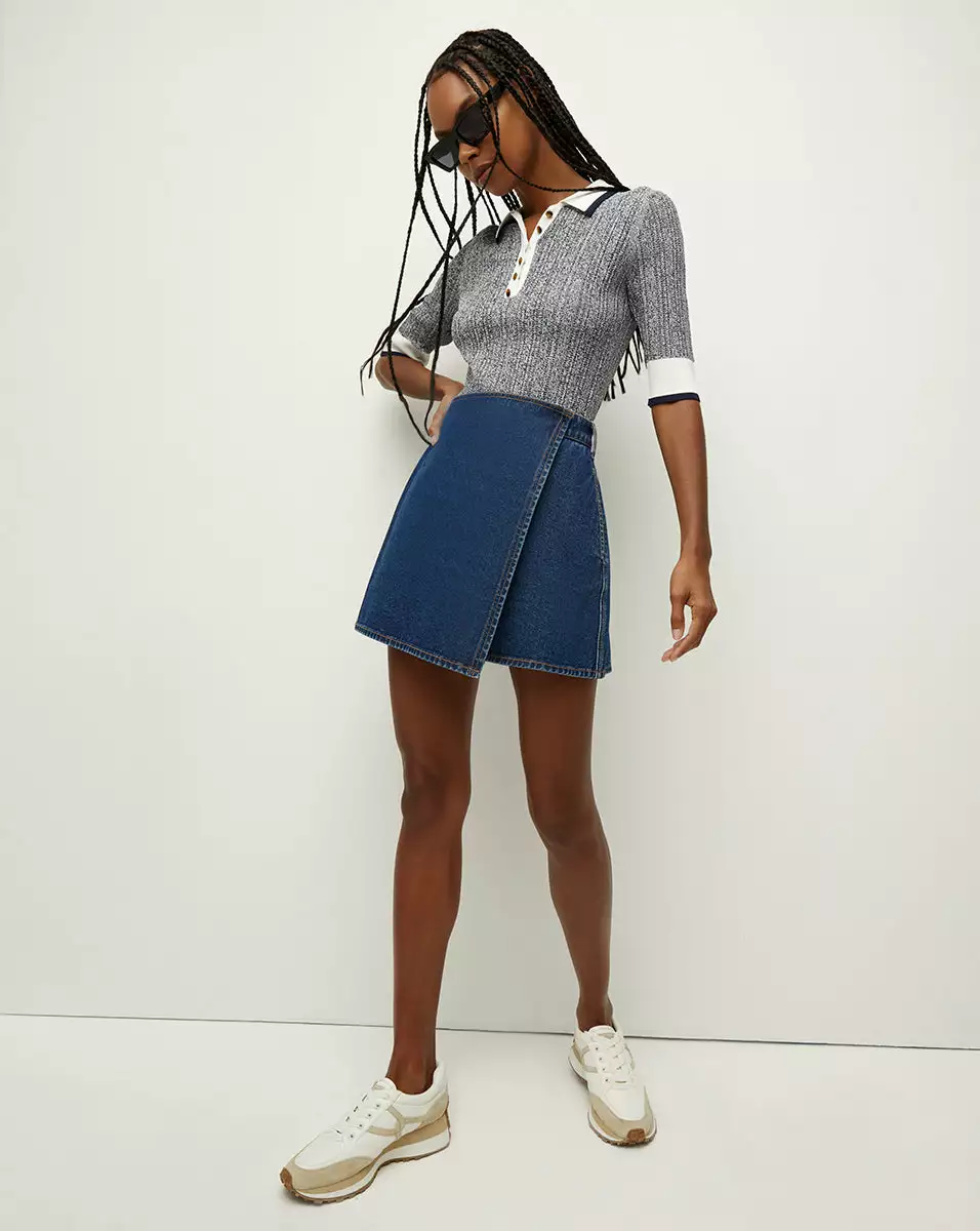 The denim skort—the summer must-have you didn’t know you needed. Expertly tailored from 100% cotton, the A-line Colin carries all the ease of a relaxed pair of shorts with the chic sophistication of a wrap skirt. Endlessly versatile, this will be a new favorite for weekends and vacations alike. To dress it up, just add a polished jacket and heels.