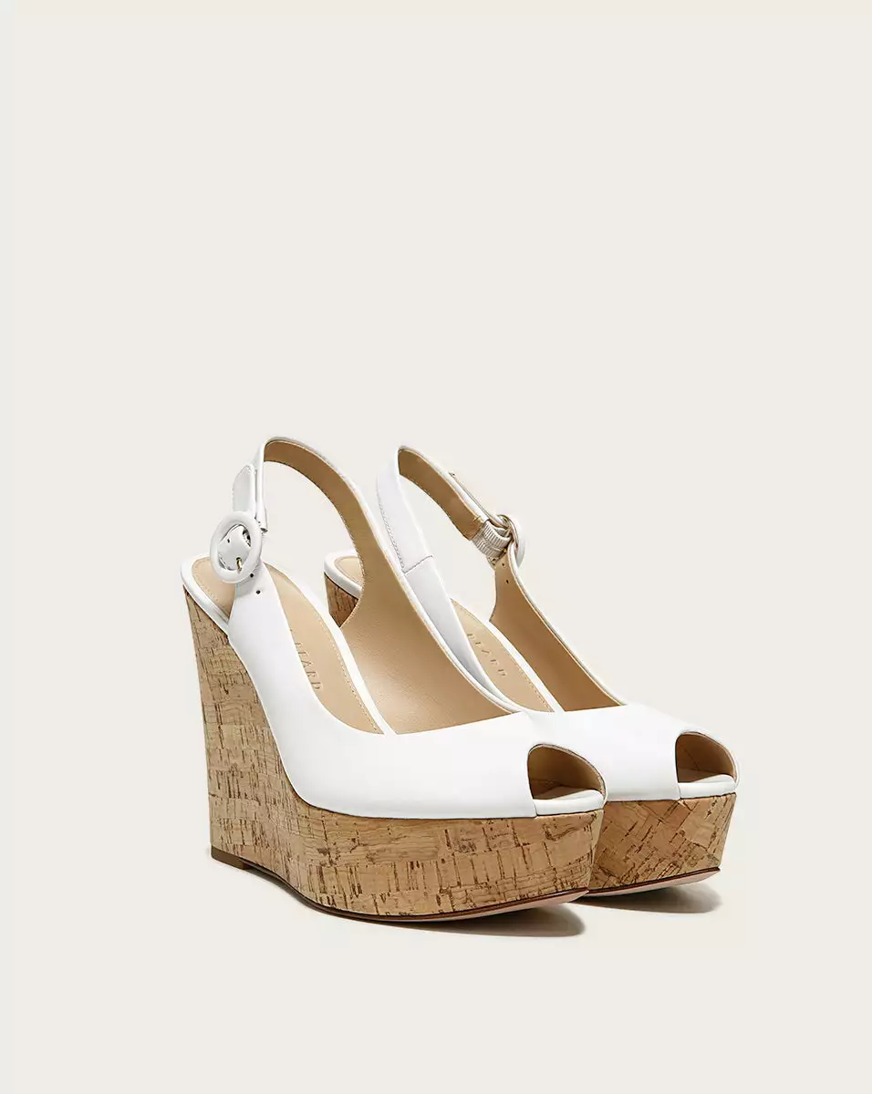Our Dali sandals feature a substantial cork wedge platform and heel, along with a white leather peep-toe vamp. We love wearing this glamorous, vacation-ready style with our casual minidresses for a standout look.