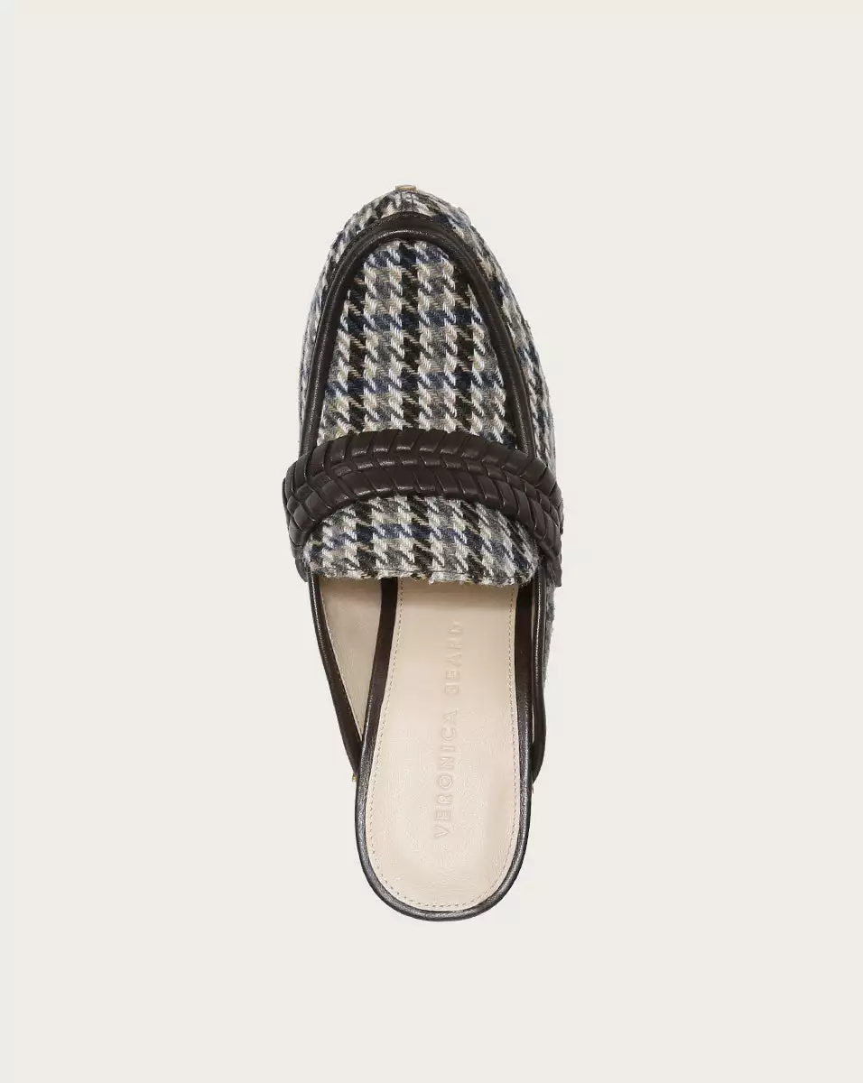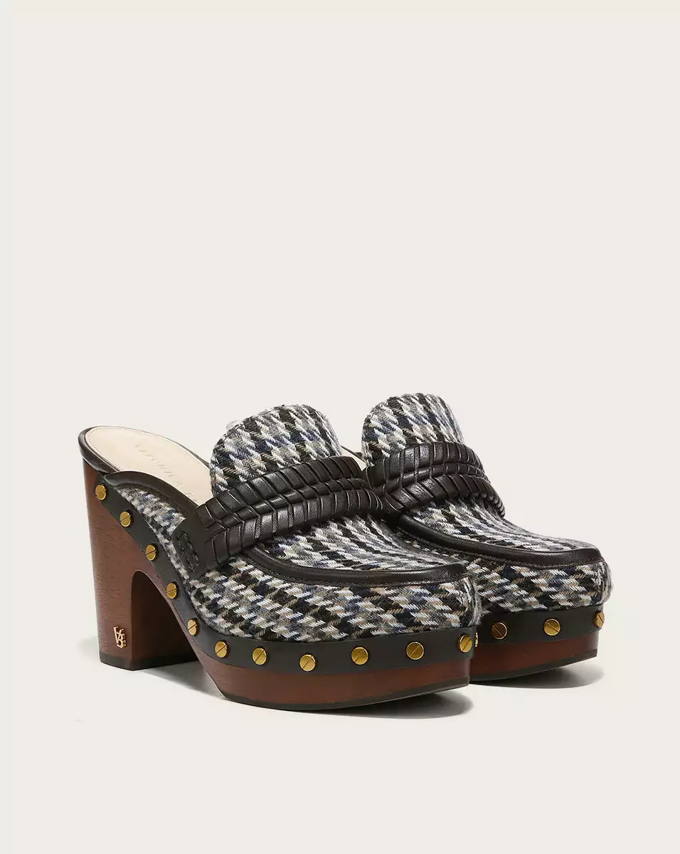 The statement-making everyday shoe you’ve been waiting for. The Delia clog heel, now updated in houndstooth, features a fabric upper along with a leather braided detail at the vamp. A studded trim completes this chic and fashion-forward pair. We love wearing them with just about anything to elevate our looks.