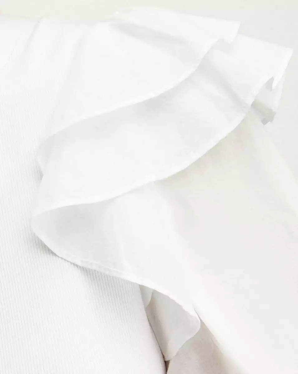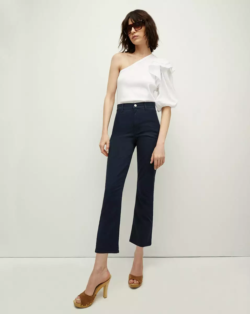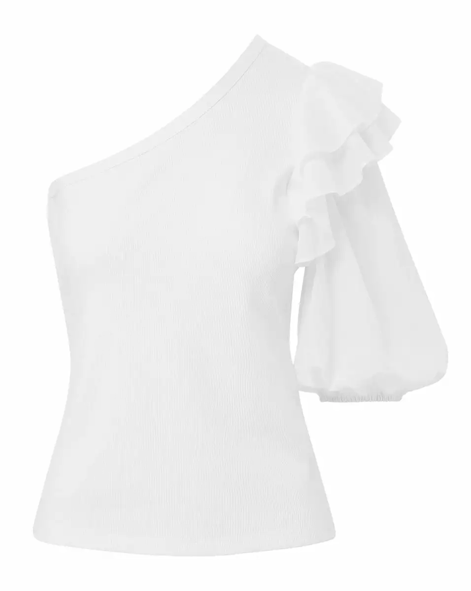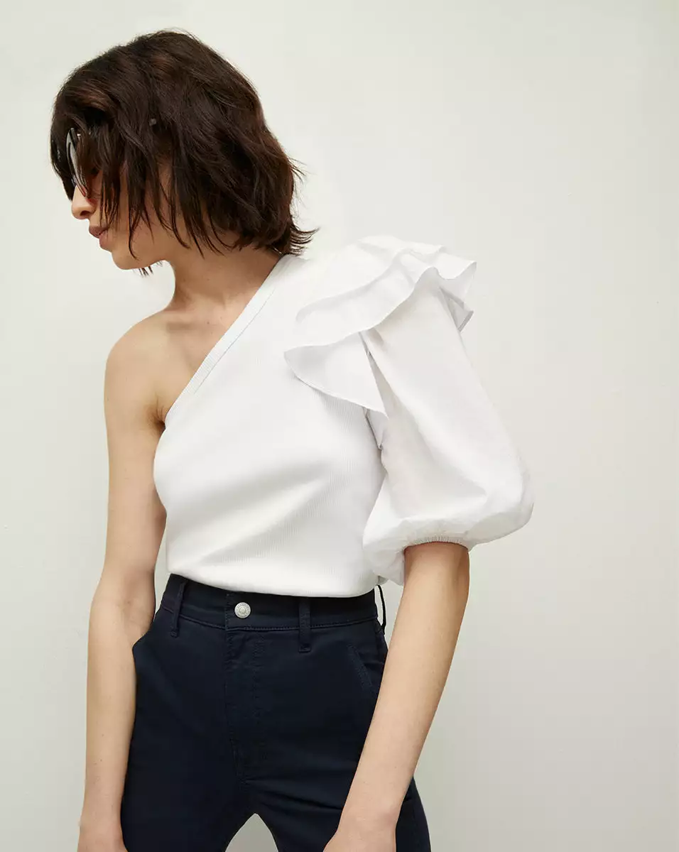 An effortless one-shoulder top that makes a statement while remaining comfortable—meet the Diantha. A double-ruffle accent at the shoulder adds to its feminine charm, while the cotton-stretch blend allows for everyday ease. Wear with your favorite jeans and wedges for a laidback yet polished look.