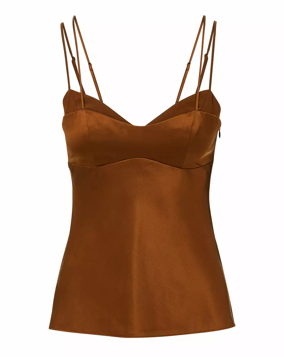 A layered bustline adds dimension and distinction to our Donita camisole. Crafted from luxury stretch-silk charmeuse, this feminine style is an elevated underpinning or stand-alone piece. An empire inverted V-bustline, adjustable double straps, and fluid bias-cut drape complete its design. Wear with its coordinating slip skirt for a high-shine moment or pair it back to jeans for a casual yet refined look.
