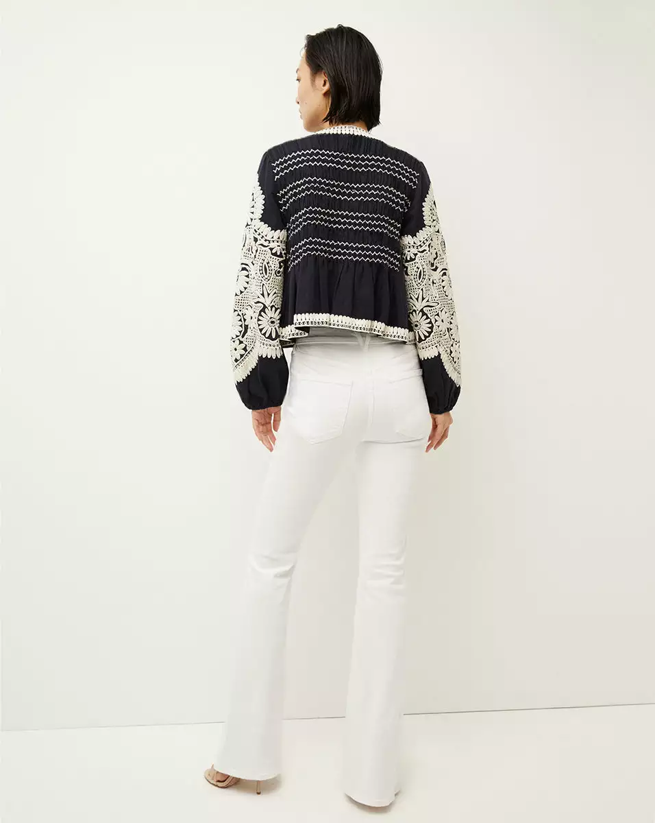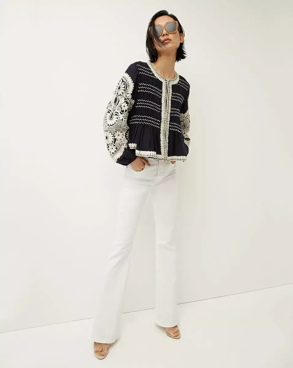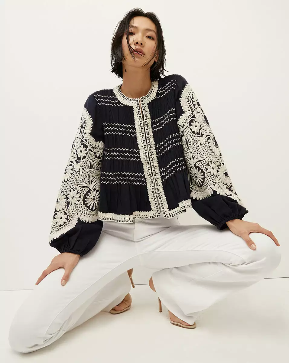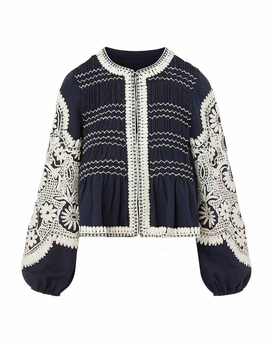 The Dorian is the jacket for spring. A lightweight linen-cotton blend meets intricate floral embroidery. Gathered topstitching on the front and back create flounced lower half. Blouson sleeves complete the look with breezy volume. Pair with white shorts and flat sandals for those chilly nights-by-the-beach.