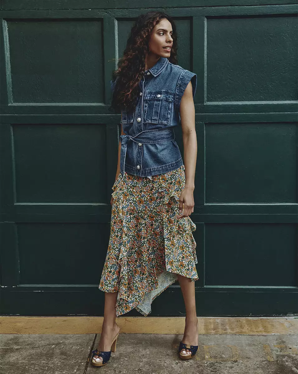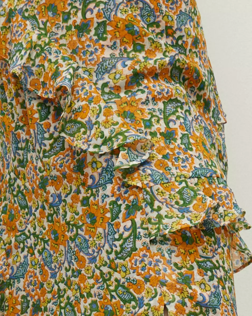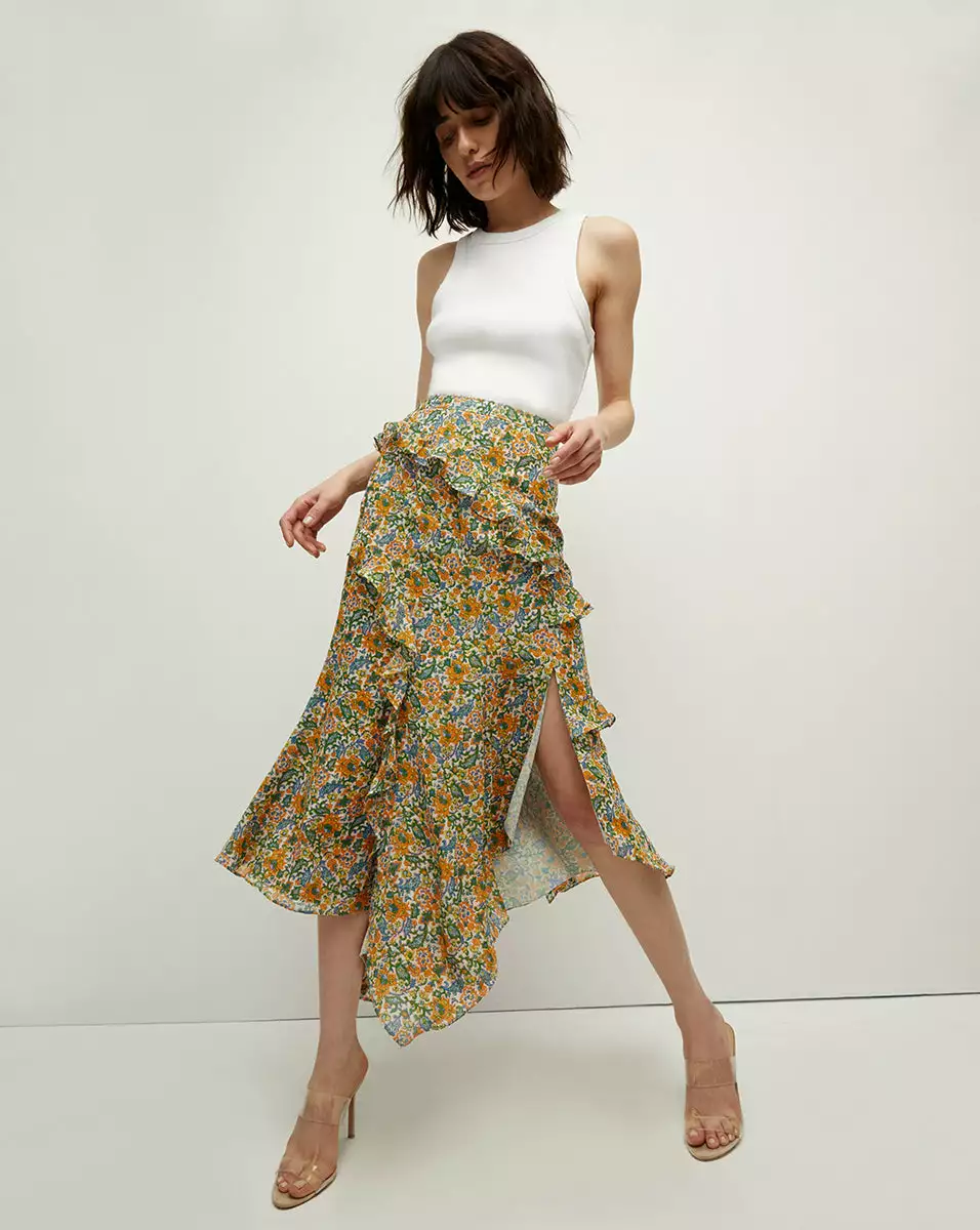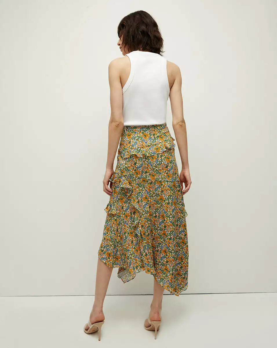 In a vibrant and bold floral print, the Eleonora skirt features a midi length, asymmetrical hem, and ruffle detailing. A side slit completes this romantic, 100% silk style. Add downtown edge by styling with a leather jacket and stiletto booties.