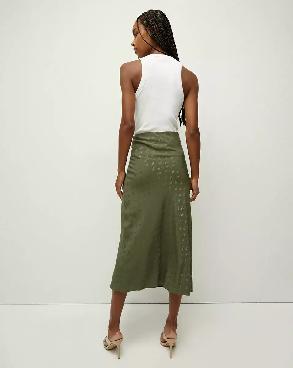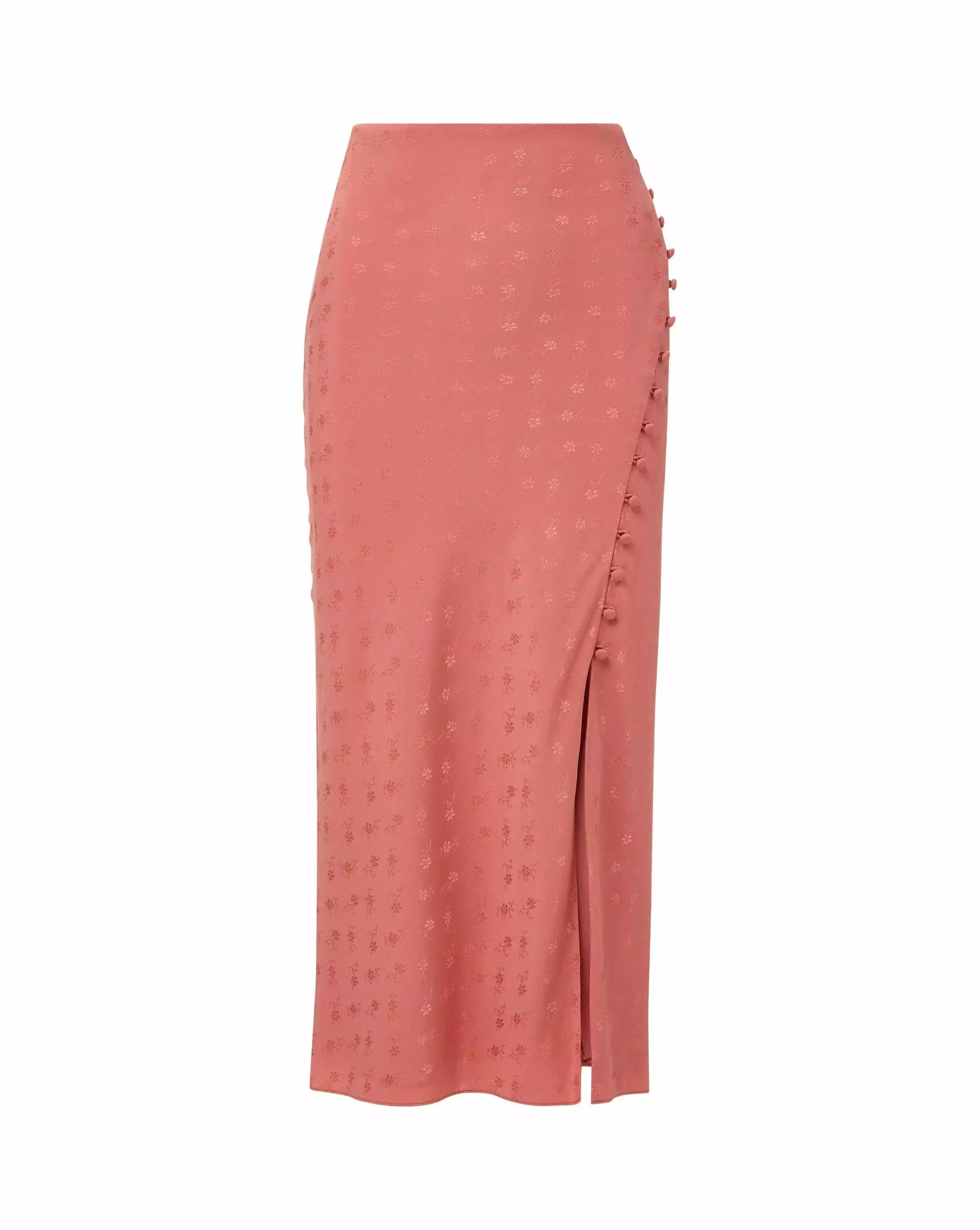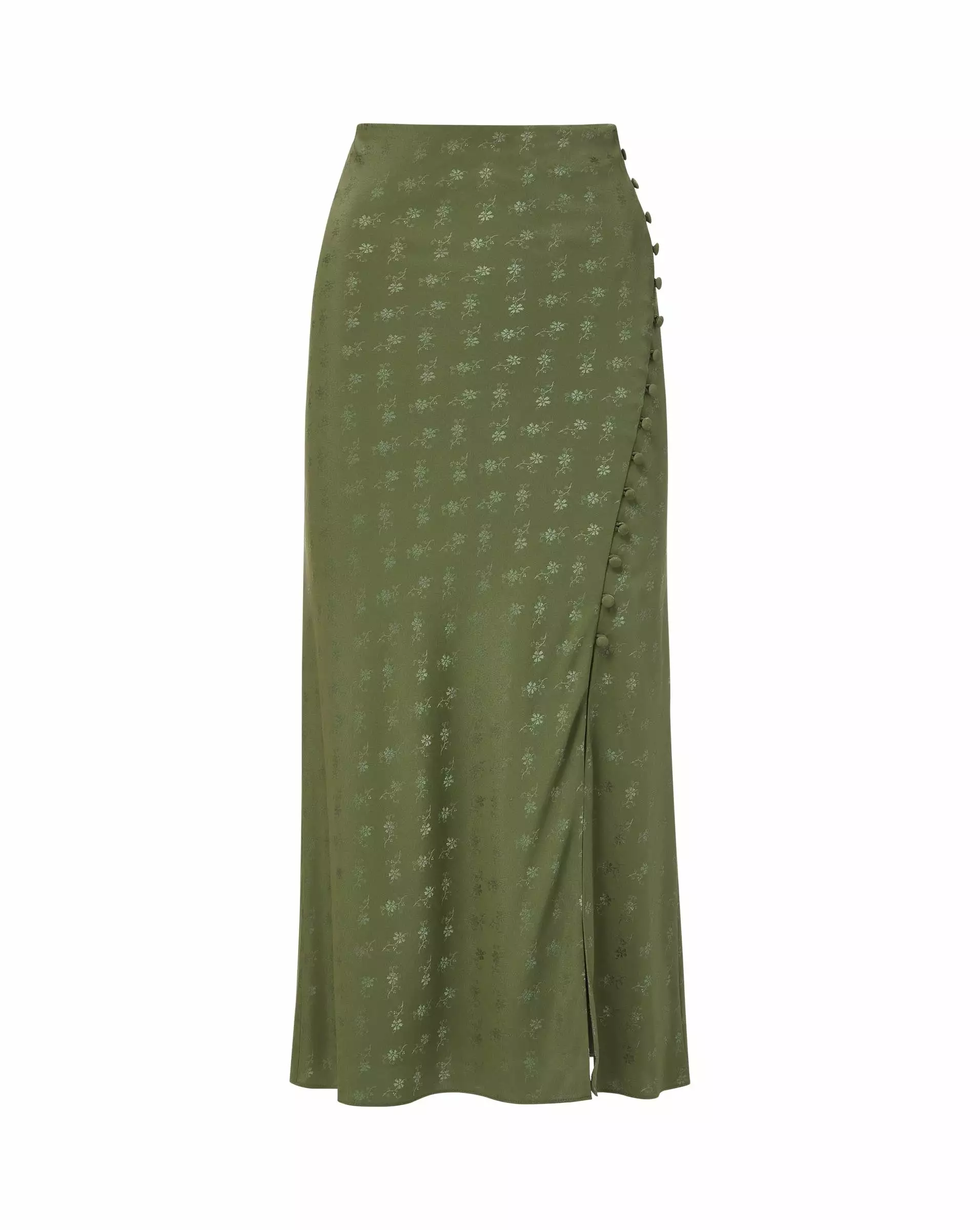 Cut from a fluid custom floral jacquard silk, this wrap-style skirt is the wear-everywhere skirt to take you through summer. With a high-waist and an easy fit, it’s falls to a midi hemline. Asymmetrical tonal fabric-covered buttons finish the look. Style it with a simple tank and slides for a Nineties-inspired look.