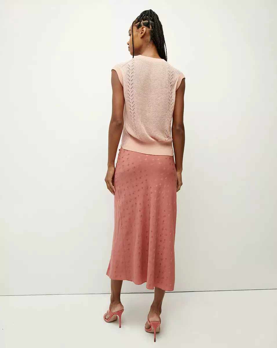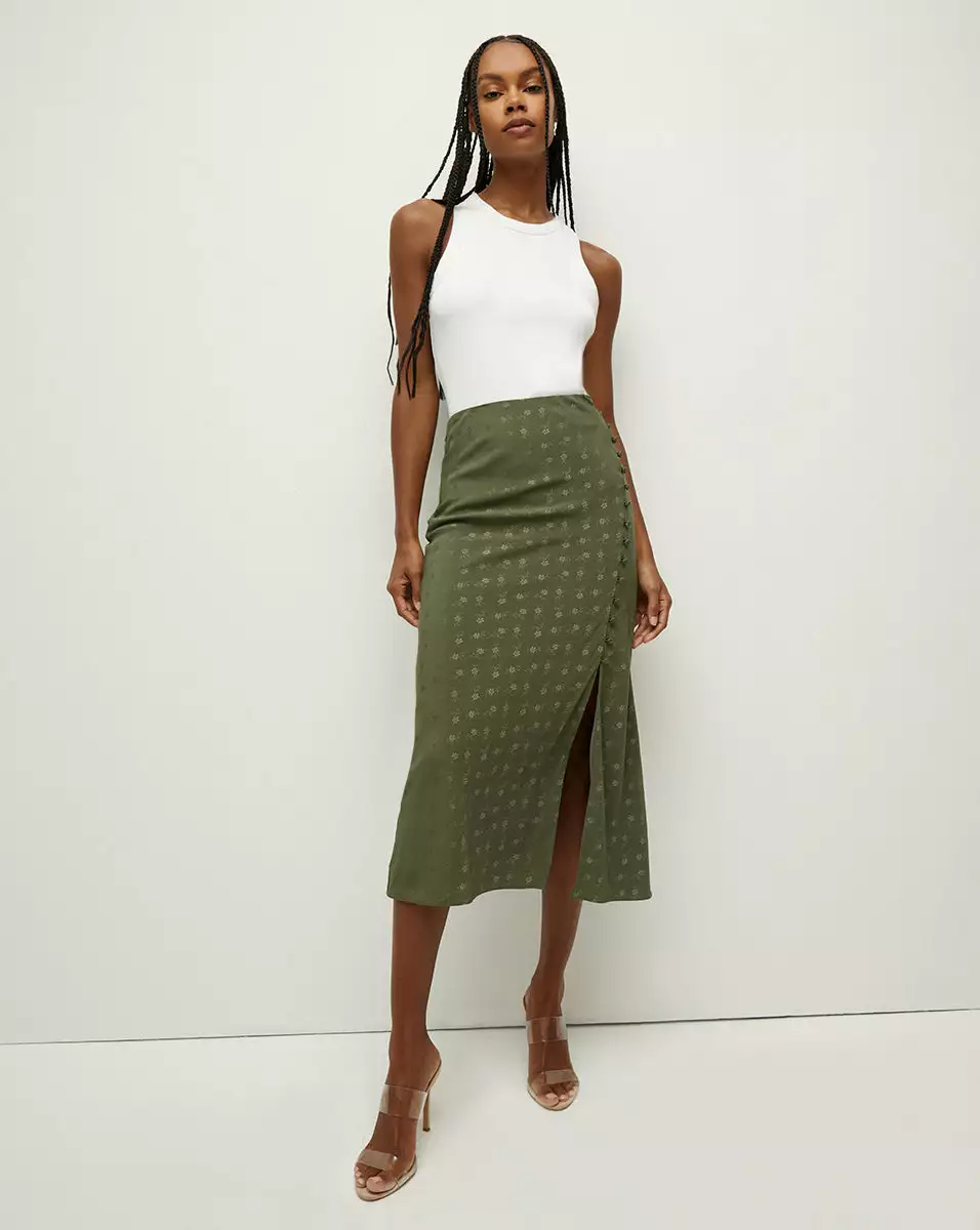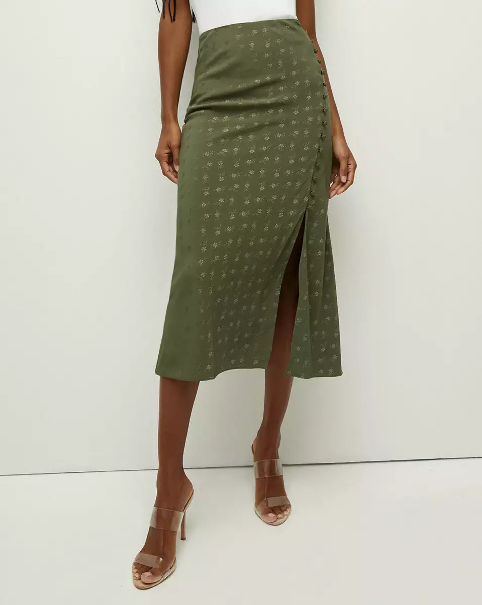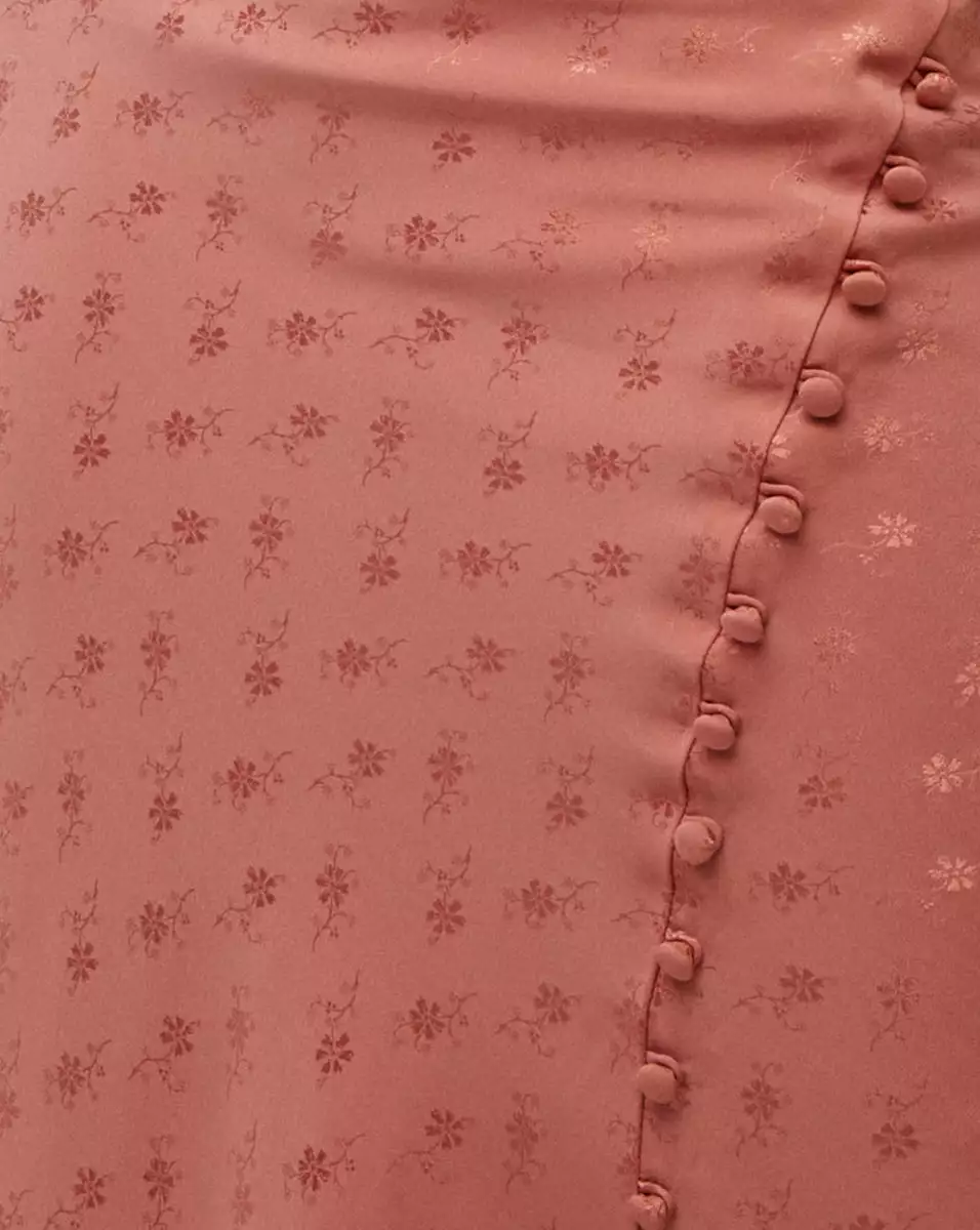 Cut from a fluid custom floral jacquard silk, this wrap-style skirt is the wear-everywhere skirt to take you through summer. With a high-waist and an easy fit, it’s falls to a midi hemline. Asymmetrical tonal fabric-covered buttons finish the look. Style it with a simple tank and slides for a Nineties-inspired look.