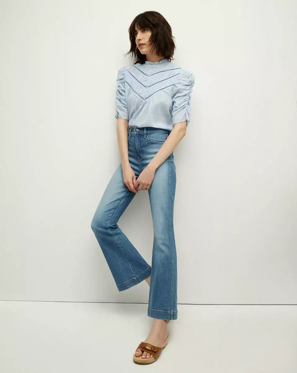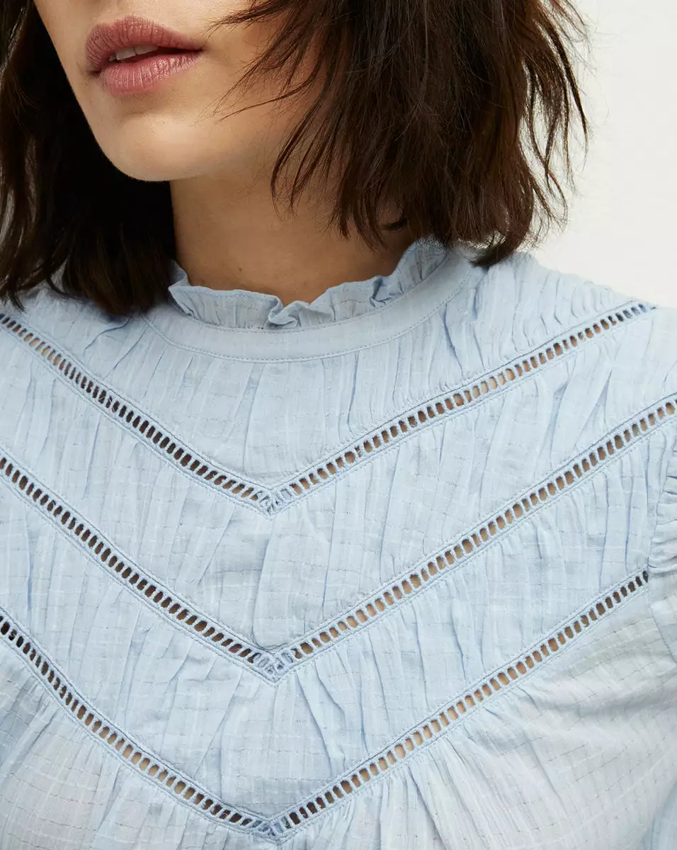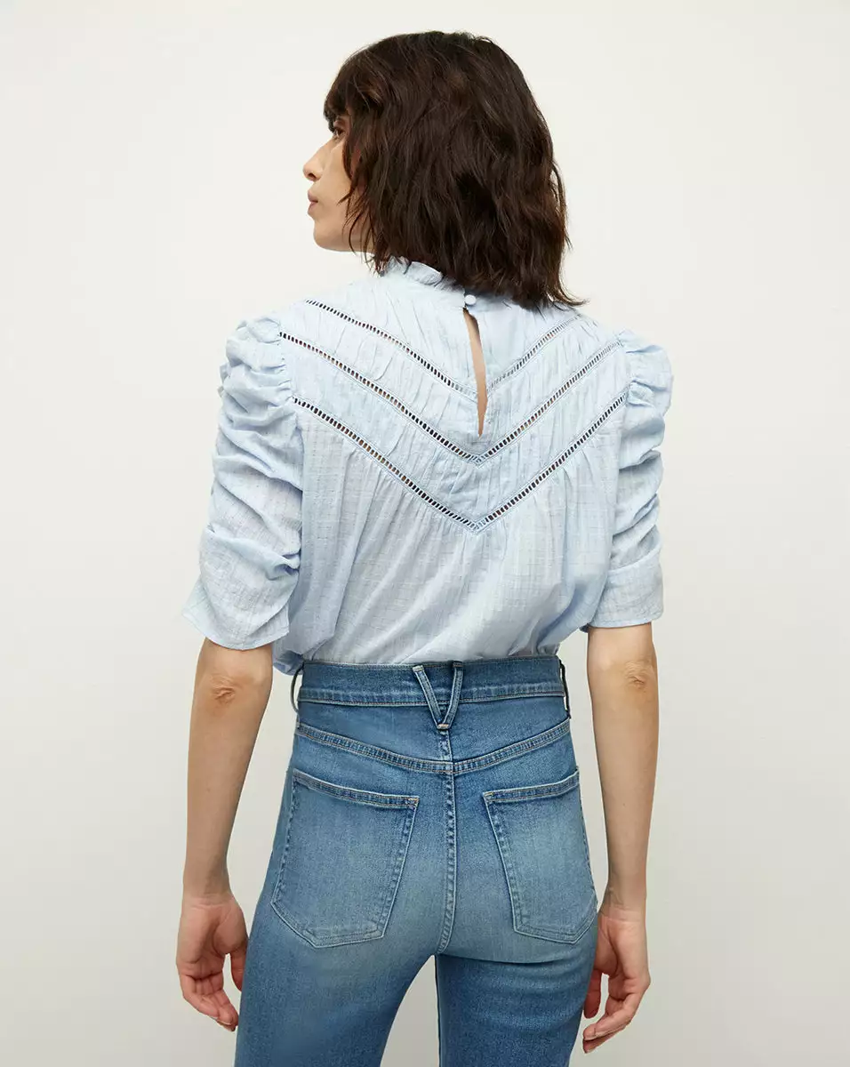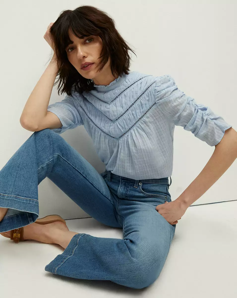 Made from 100% textured cotton, the Frasier top is our modern spin on bygone Victorian romance. Cut for a relaxed fit, this summer go-to features ruched detailing, including on the puffed sleeves, as well as a ruffled mock neck. Intricate ladder stitching across the front yoke completes the look. Pair with denim for everyday elegance or up the feminine ante with a gathered skirt.