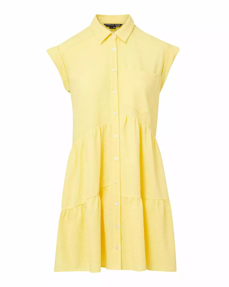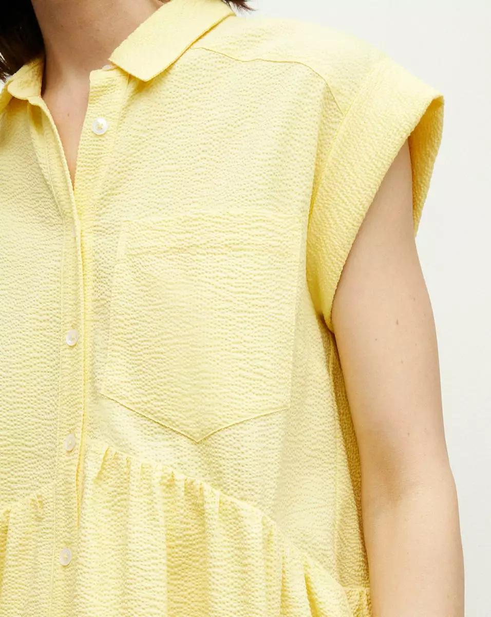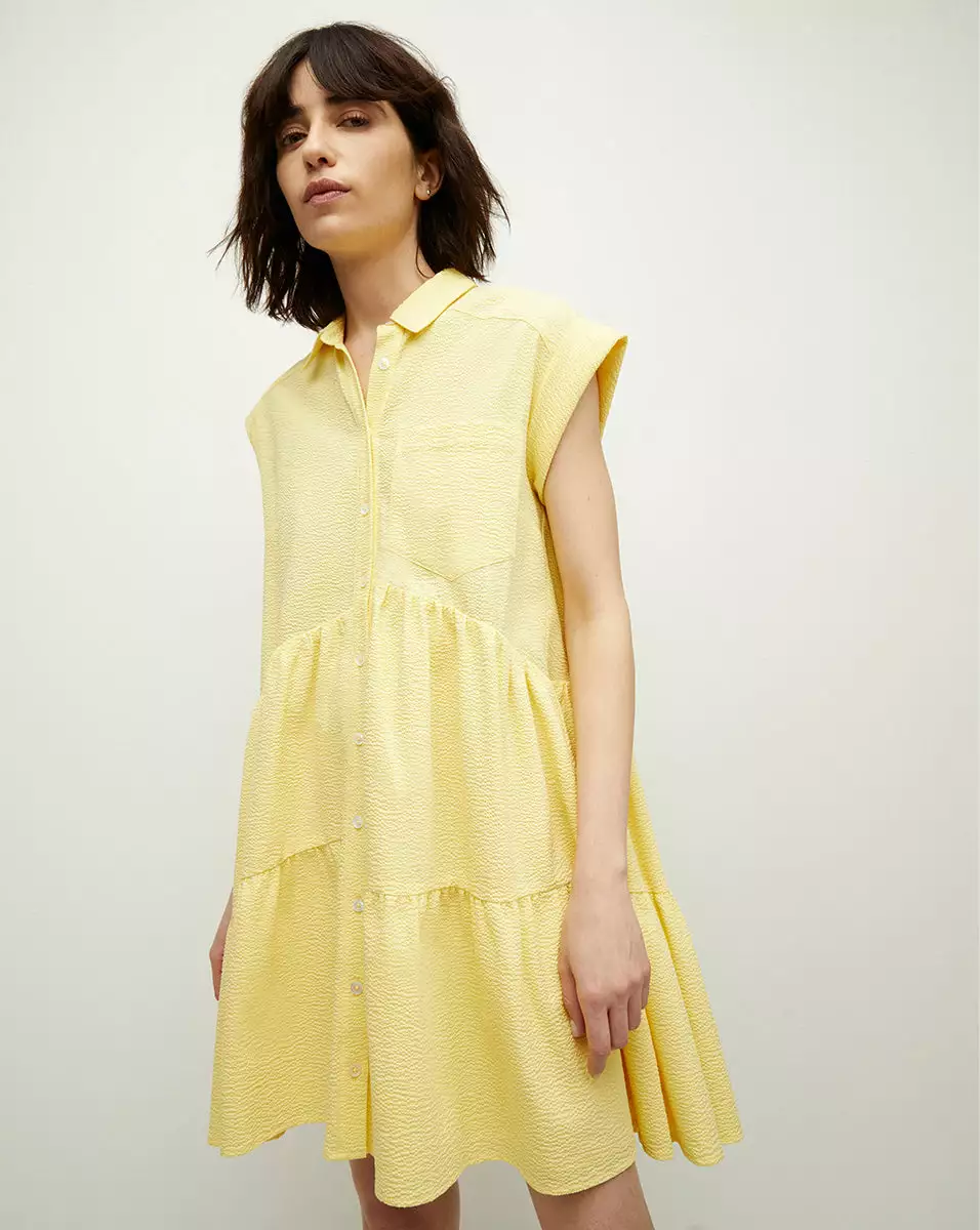 The Harrow dress is a decidedly feminine take on the classic shirtdress. With its capped sleeves, tiered silhouette and flounced hem, pale yellow denim dress is our idea of the effortless weekend style. Contrast stitching and a patch pocket complete the look. Wear with flat sandals or sneakers during the day; switch to heels for night.