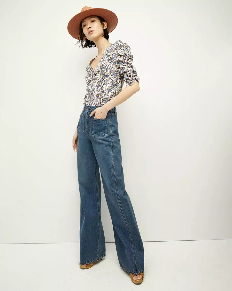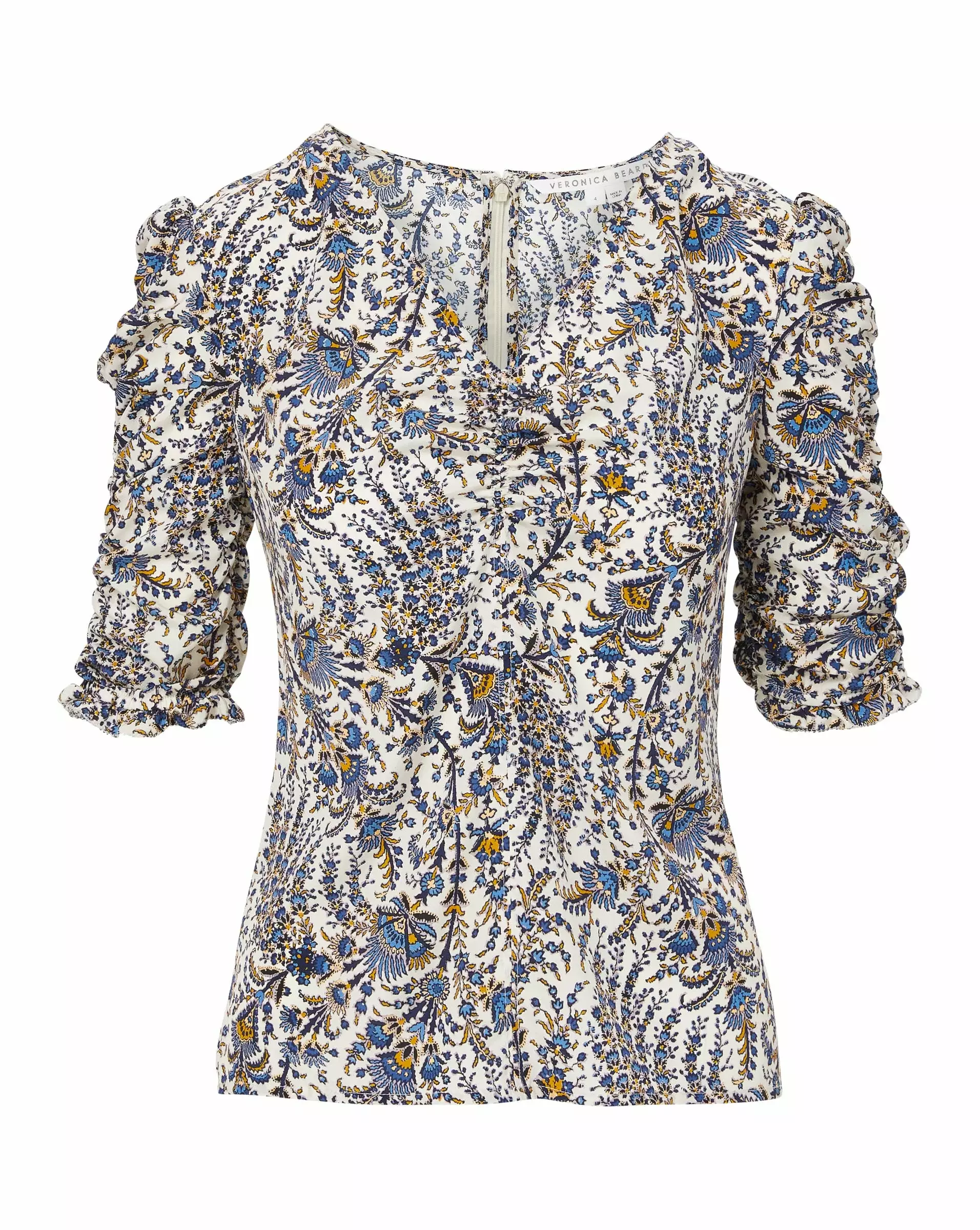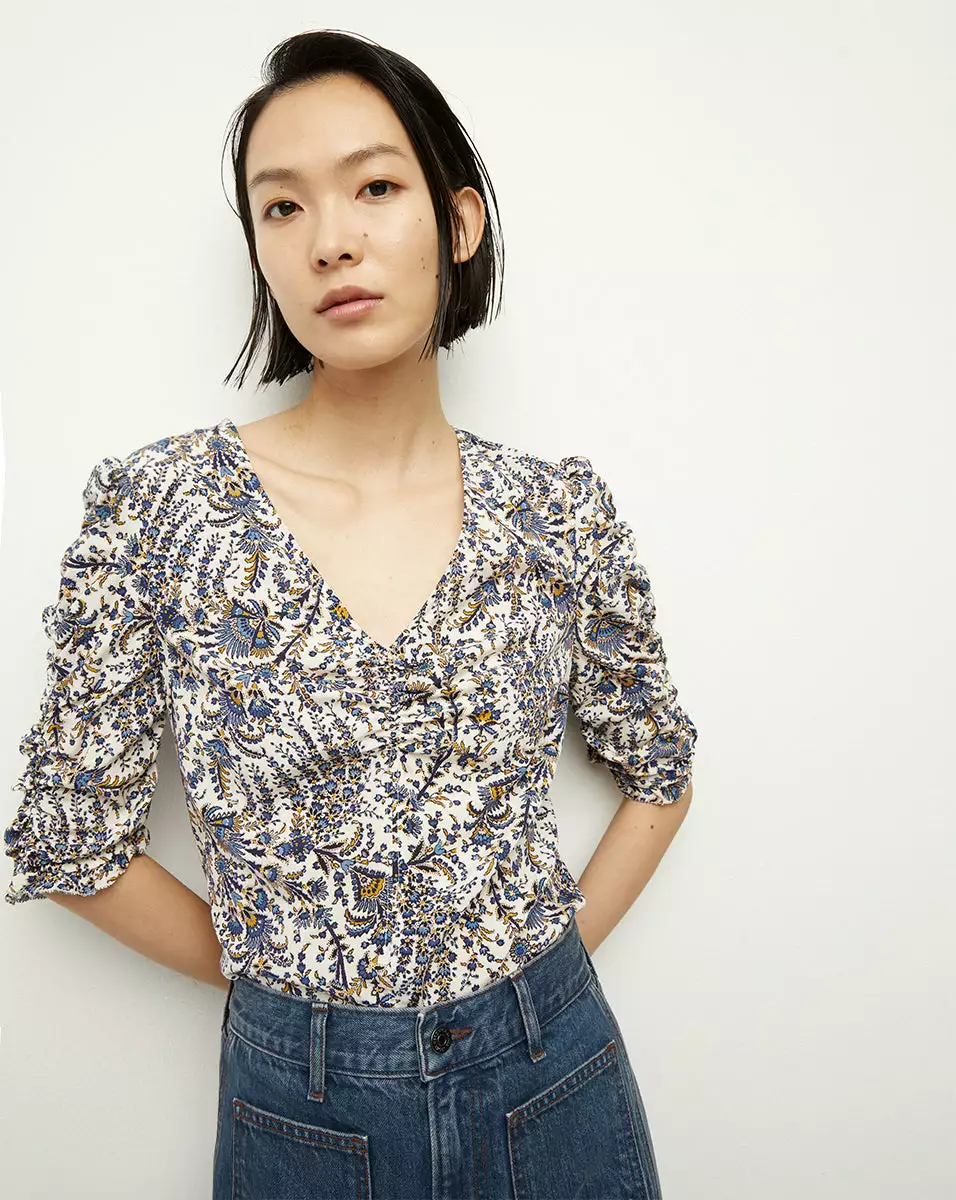 Crafted from a luxe stretch-silk blend, the ultra-feminine Henrietta features an ornate floral print and puffed, ruched sleeves; additional ruching down the center further flatters the figure. Equal parts relaxed and refined, this V-neck silhouette will easily take you from desk to drinks. Pair with jeans and sandals for to elevate the everyday or dress it up with pants and stilettos.