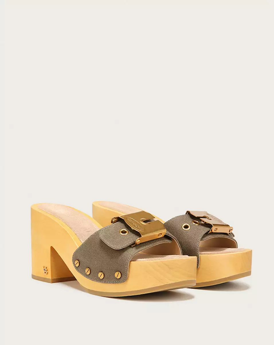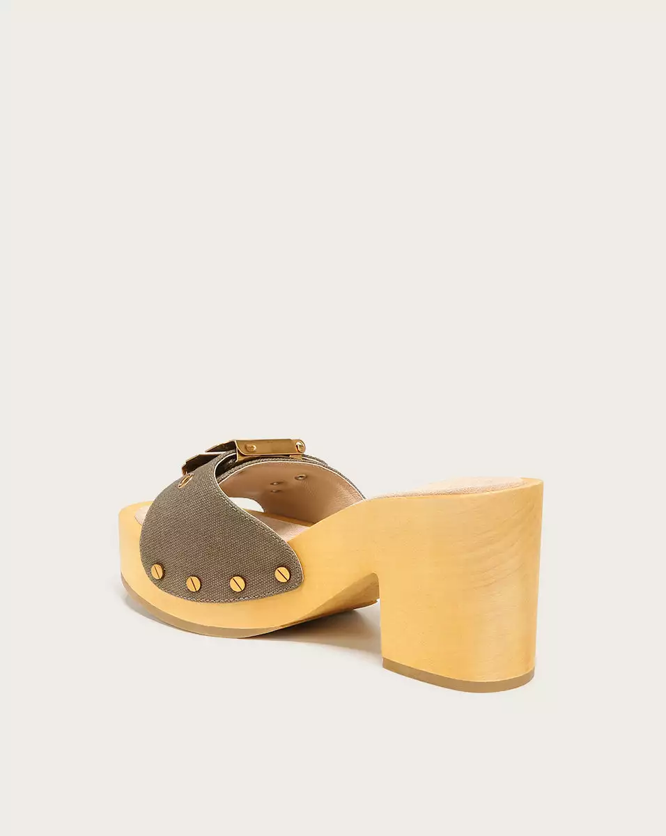 Lightweight and perfect for everyday wear, the Hula is a classic clog sandal, updated with a 3 ½ inch block heel. Featuring a wood sole made from soft, natural basswood, this slip-on style is finished with Dr. Scholl’s signature metallic buckle at its organic canvas vamp. Stud embellishments, a contoured wood footbed, along with a rubber sole, complete the look of this must-have style.