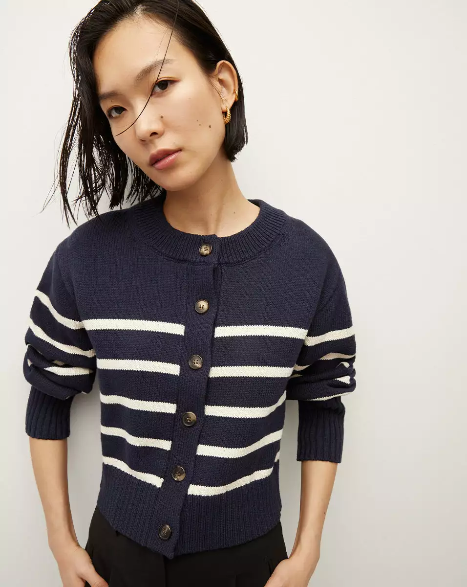 A nautical striped cardigan is forever. Introducing the Kylin, made from 100% cotton, and designed to be an everyday go-to. This timeless piece offers a relaxed, easy fit, and is finished with puffed sleeves, a slightly cropped length, and tortoise buttons. Throw it over your shoulders when temperatures start to drop or wear it alone with jeans and loafers for a classic fall look.