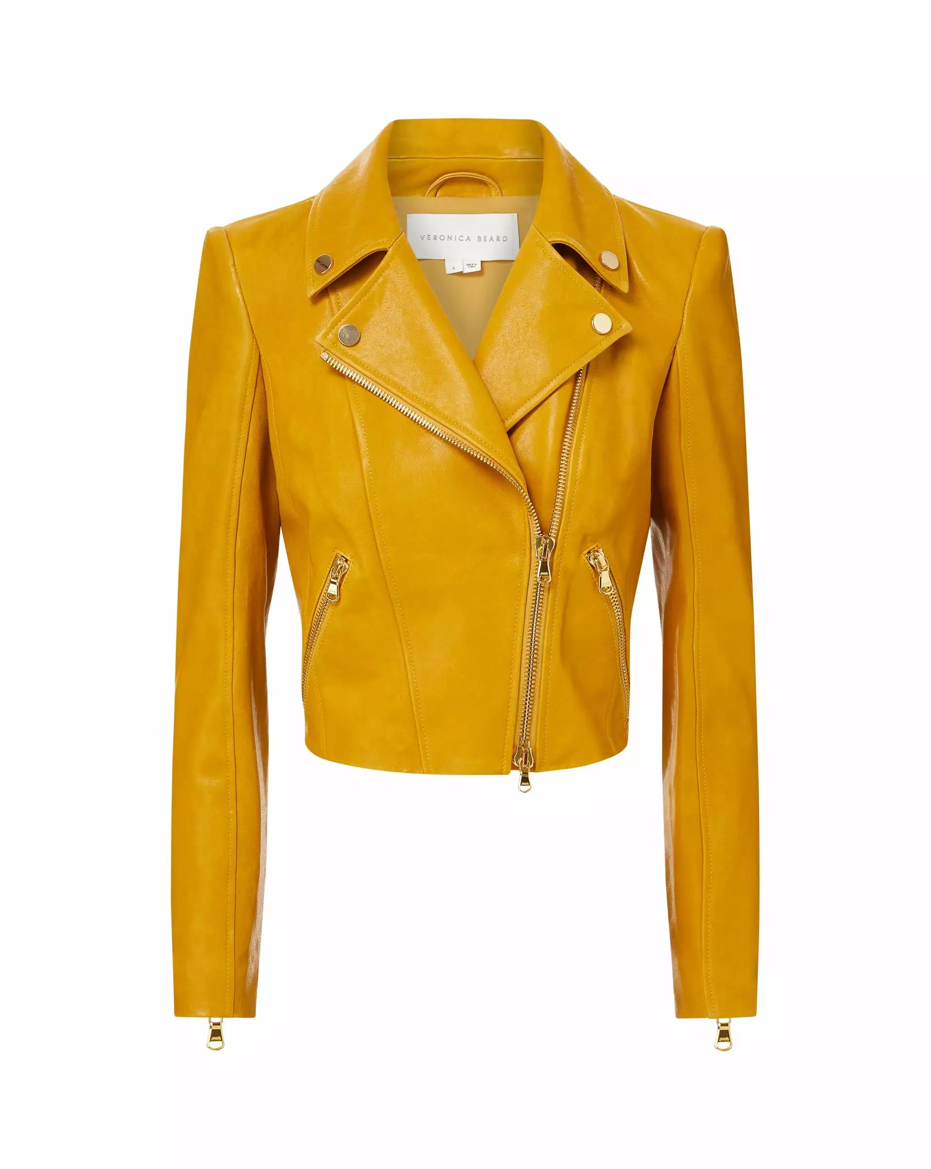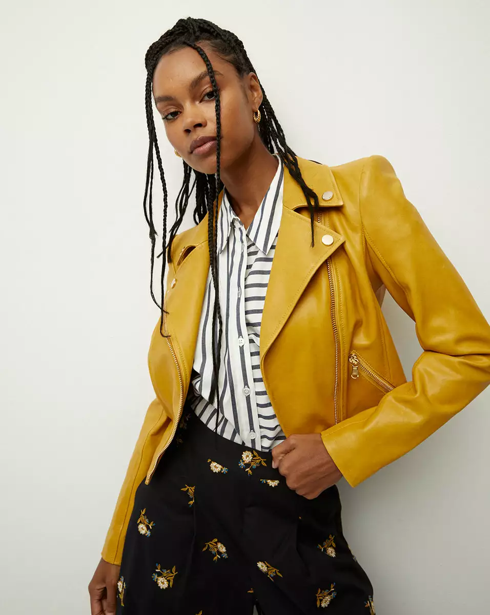 The jacket that says confidence. Its cut from glossy lambskin leather and has a shrunken cropped body. Gold-toned hardware, lapel snaps and front zips—define the look. With a perfect, had-it-forever hand-feel, this buttery leather piece can be worn over everything from shorts to flowy maxi dresses.