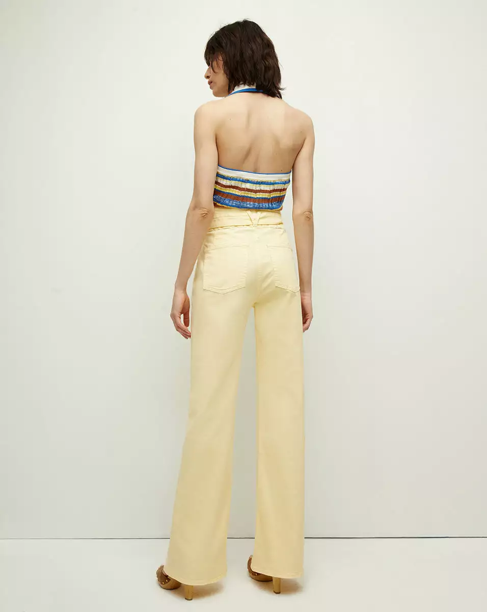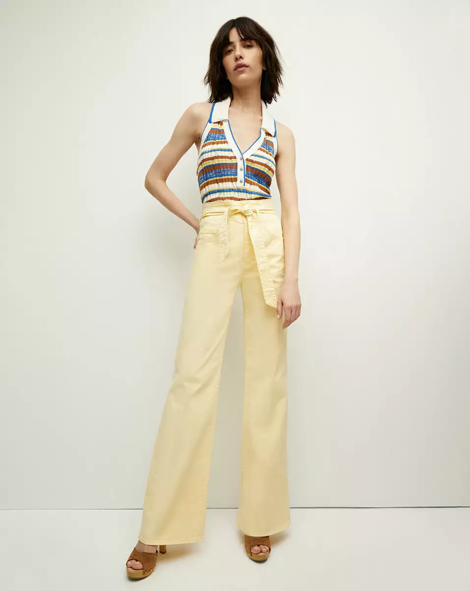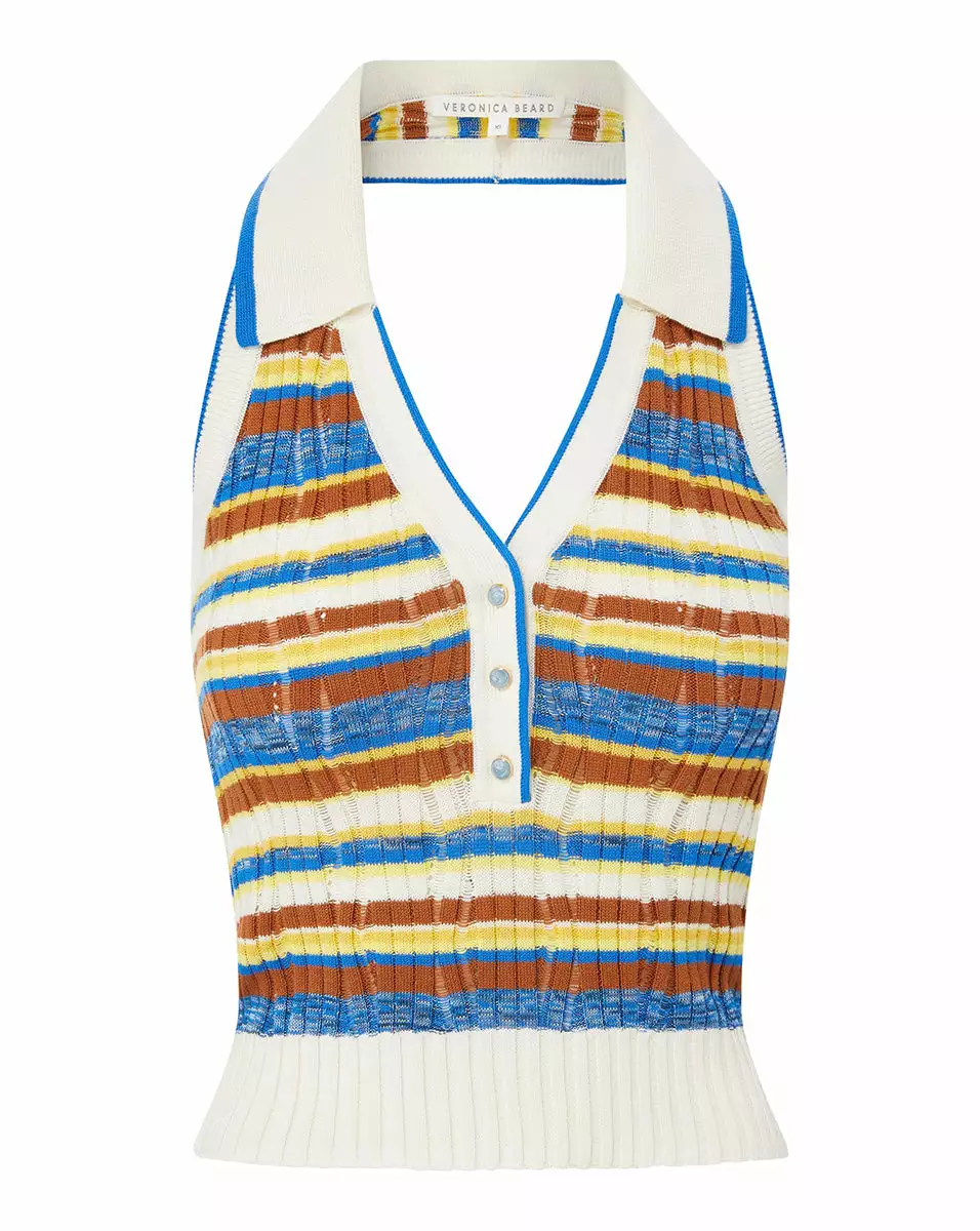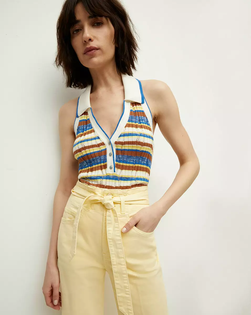 An ultra-flattering top with a Seventies spirit. In our mid-weight, transitional yarn, the Lirra in 100% cotton is everything we look for in a summer piece—colorful, textural, and feminine. With a halter neckline, collared detailing, resin buttons, and a figure-flattering knit body, it will quickly become a favorite.