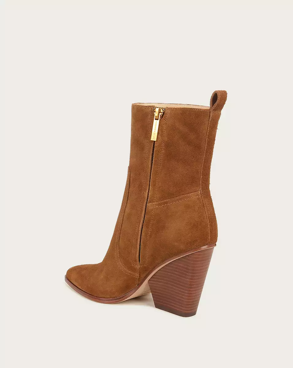 Meet Logan, the coolest bootie around. Expertly crafted from soft suede, this downtown favorite is all clean lines and sleek curves, making it a timeless silhouette that’s perfect to elevate the everyday. The diagonal stacked heel provides sturdy comfort while the sculptural pointed toe and curvilinear seaming add architectural edge. Pull tabs and a concealed zipper complete the look. Endlessly versatile, this looks as good with jeans as it does with dresses.