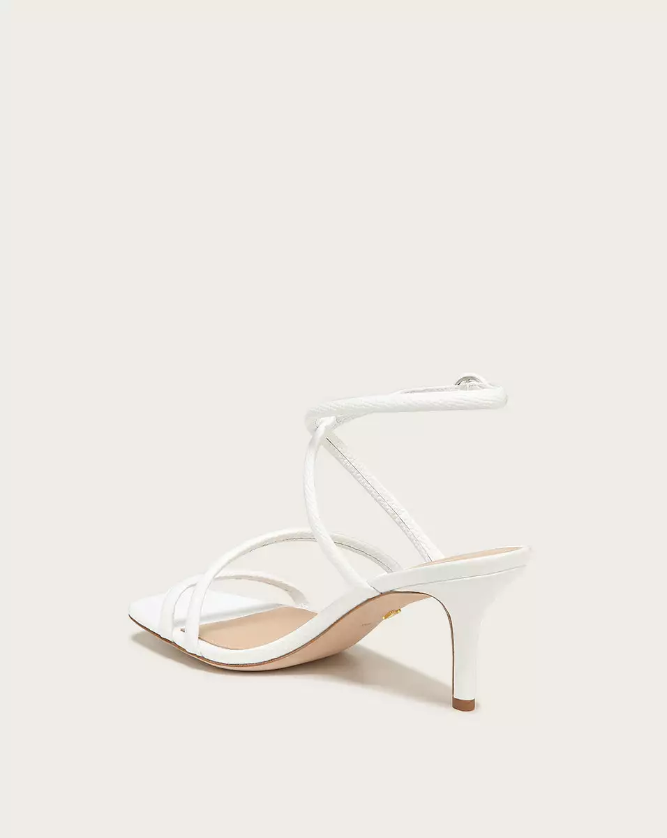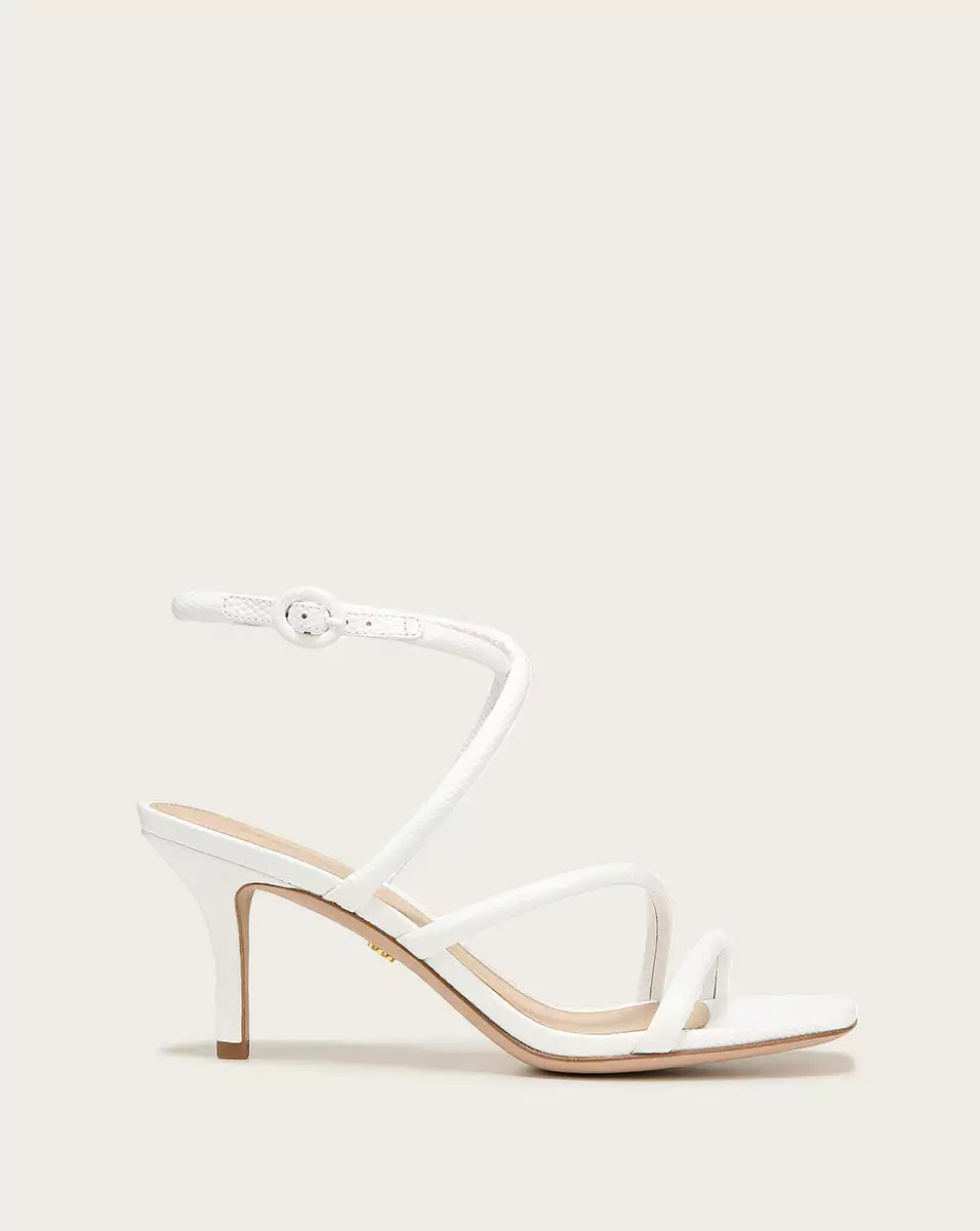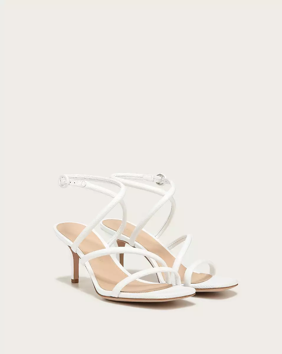 Crafted from snake-embossed leather, the Mariel sandal marries elegance and ease with its strappy silhouette and comfortable 2†kitten heel. Ideal for elevating both jeans and dresses, this wear-with-everything style is finished with leather insoles and our gold-tone logo at the base. An adjustable buckle closure at the ankle creates the perfect fit, too. Wear with an all-white outfit for monochrome dressing at its best.