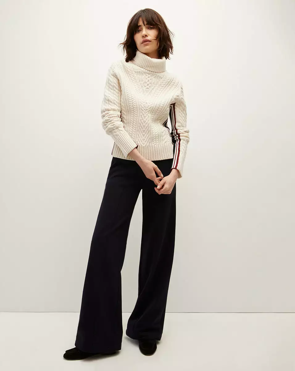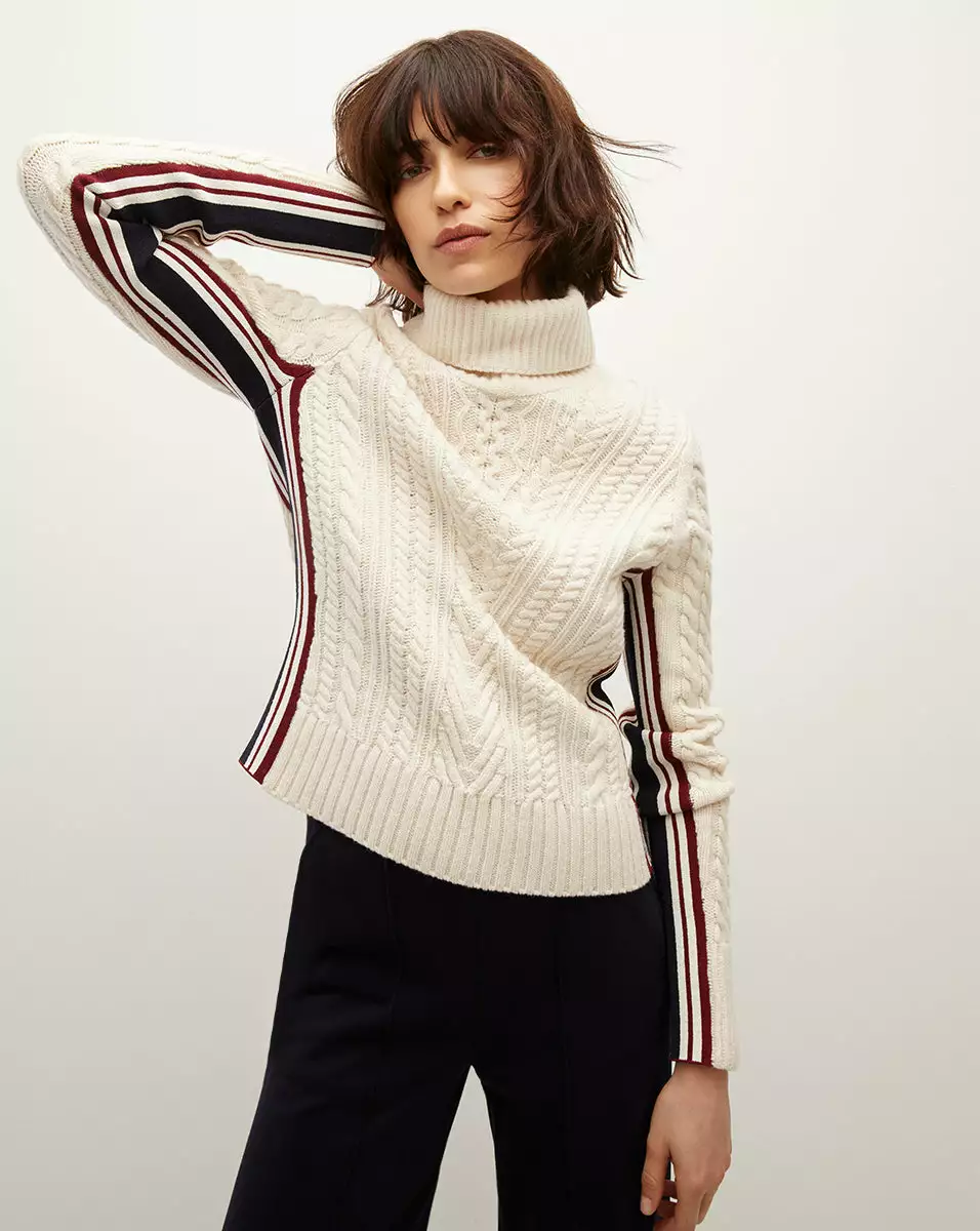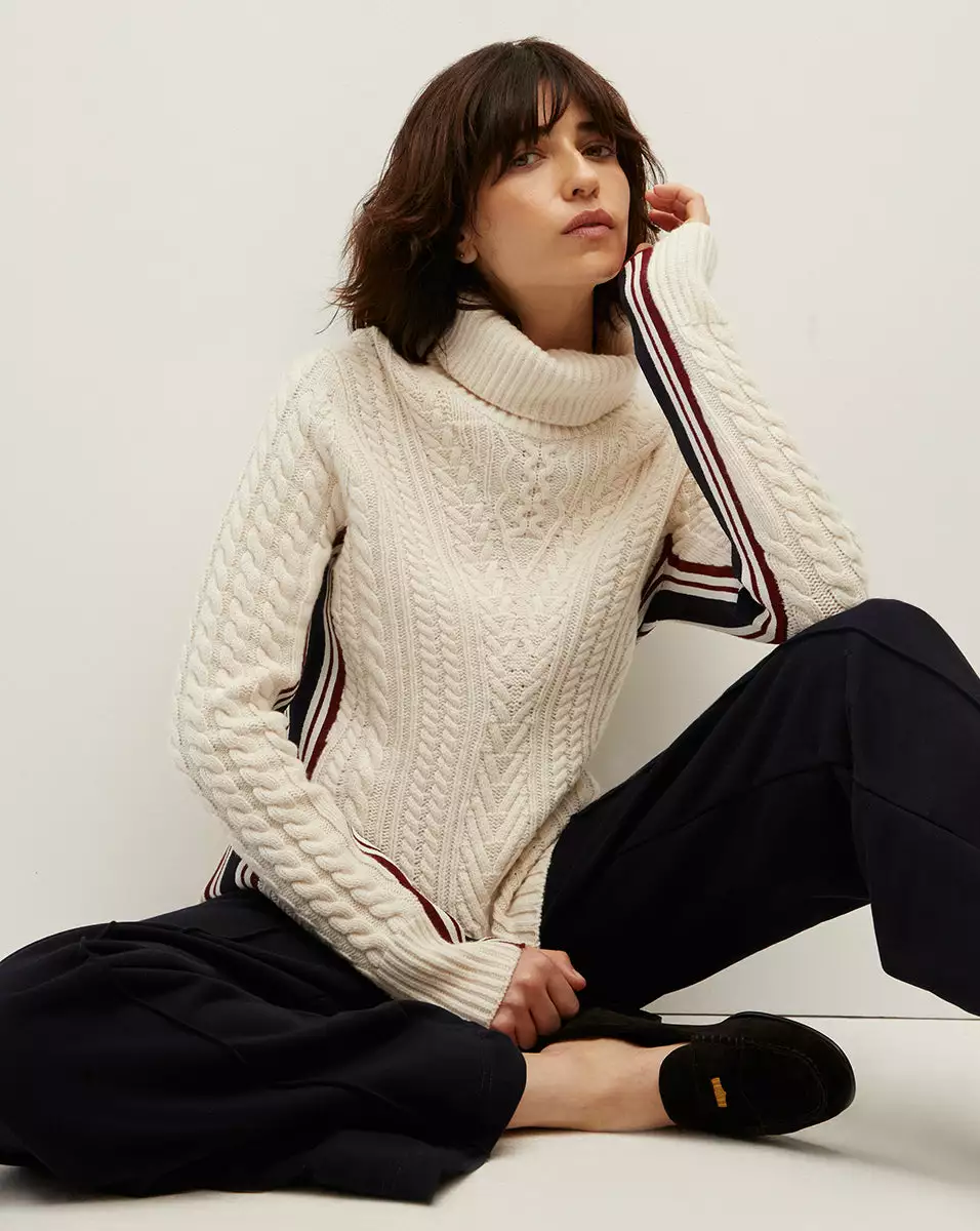 Crafted from our chunky lambswool with striped, multicolored intarsia trims along its sides, the Maril turtleneck exudes the classic-with-an-unexpected-twist look we love. The cozy style is cut for a slim fit, while the strategic knit patterns creates a flattering finish on the body. Pack it along your next winter getaway for the ultimate in après ski chic.