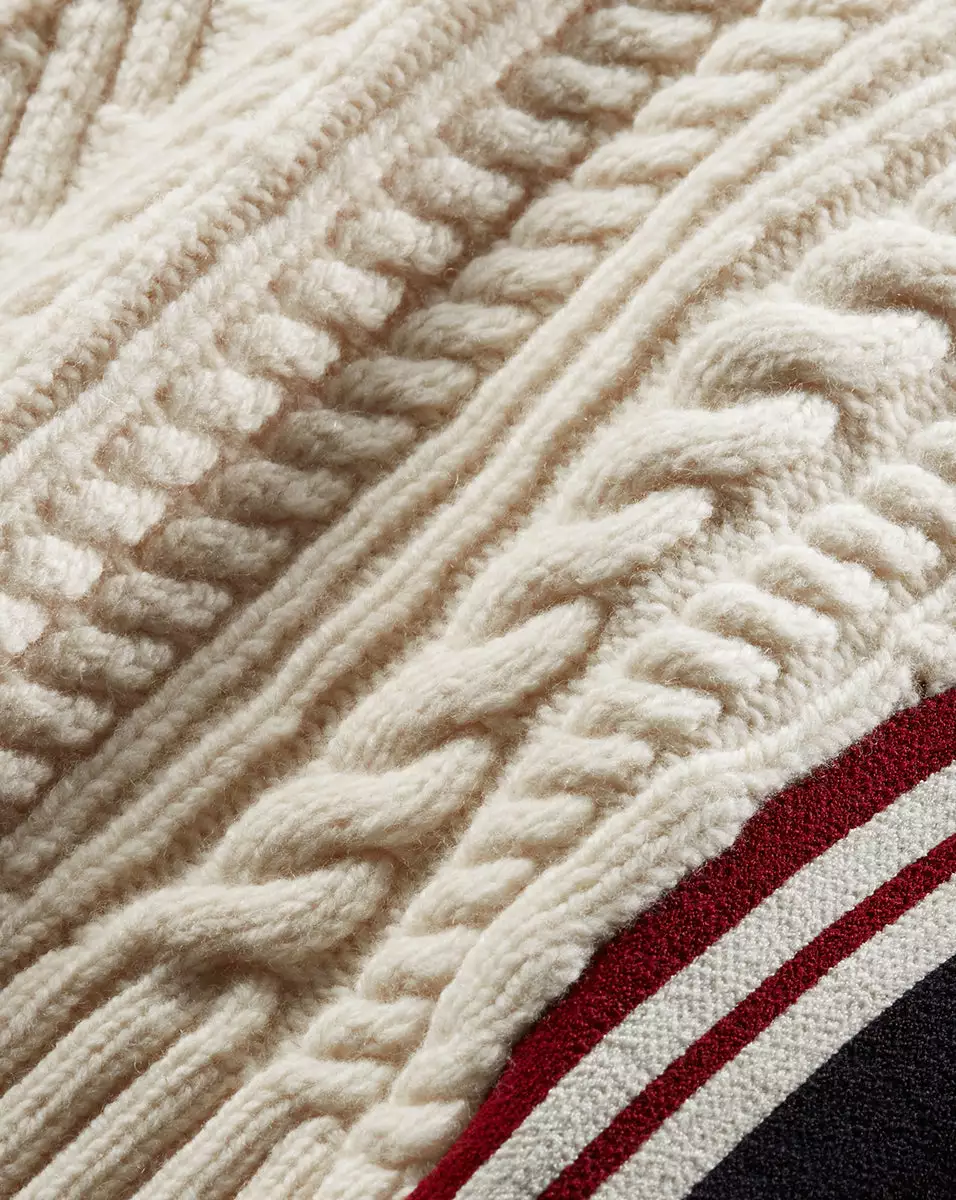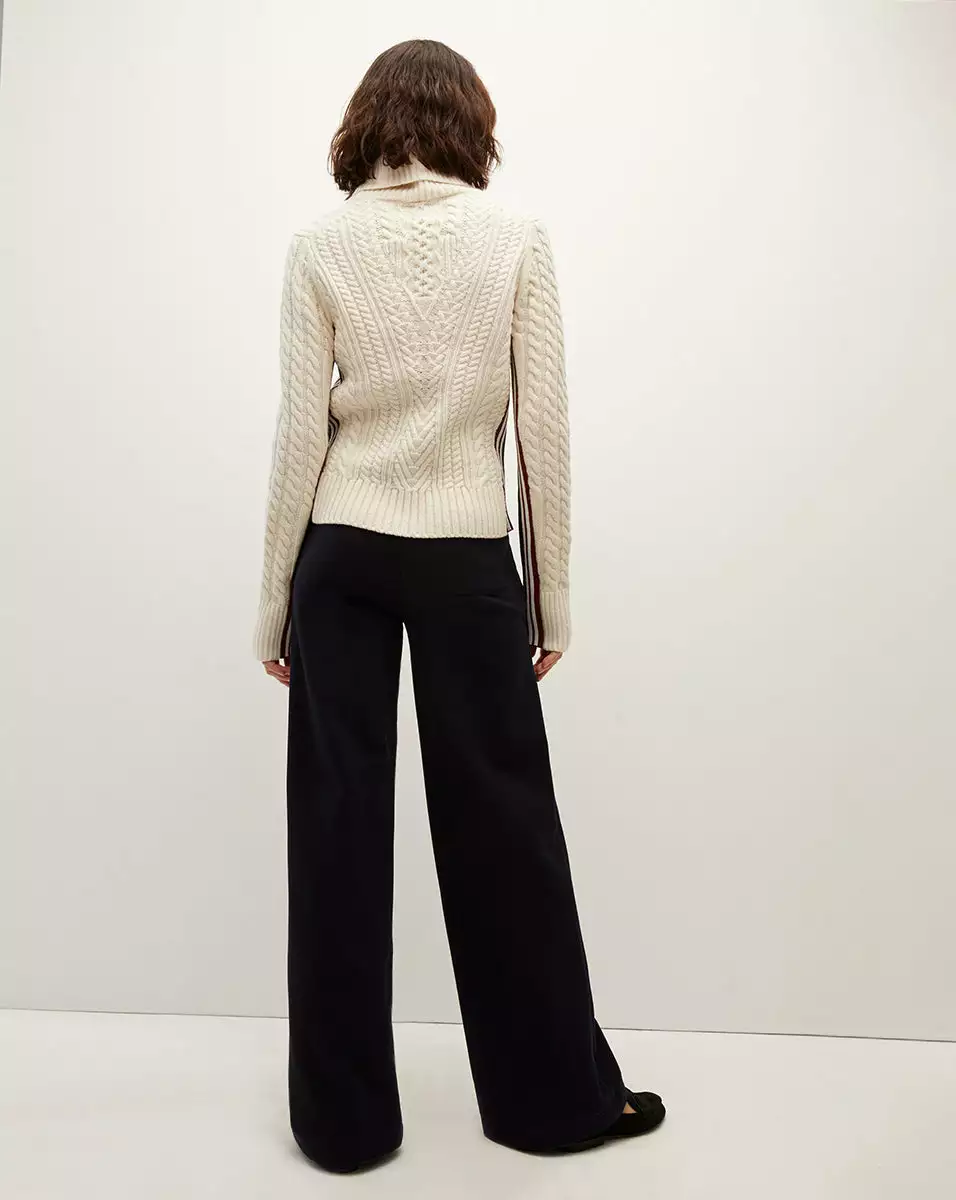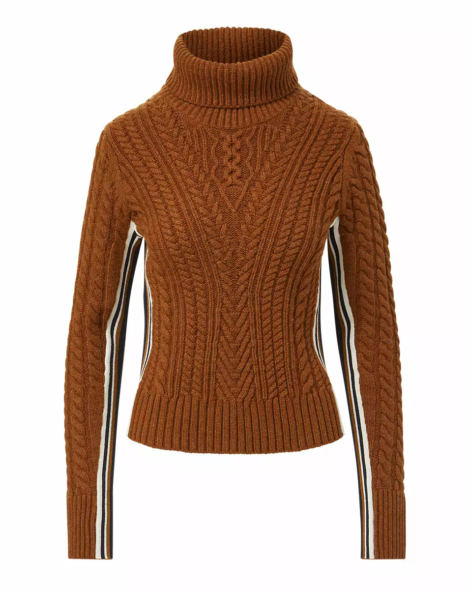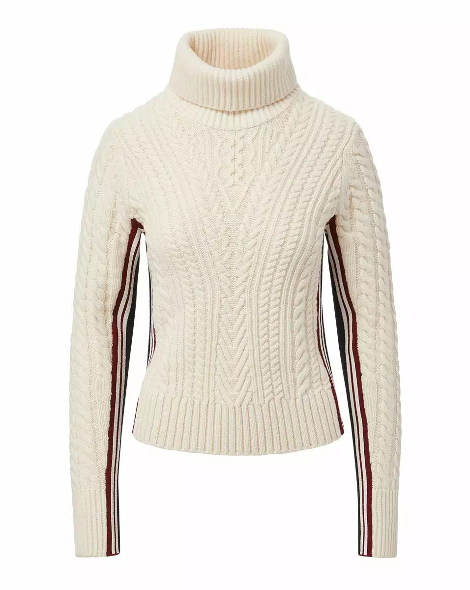 Crafted from our chunky lambswool with striped, multicolored intarsia trims along its sides, the Maril turtleneck exudes the classic-with-an-unexpected-twist look we love. The cozy style is cut for a slim fit, while the strategic knit patterns creates a flattering finish on the body. Pack it along your next winter getaway for the ultimate in après ski chic.