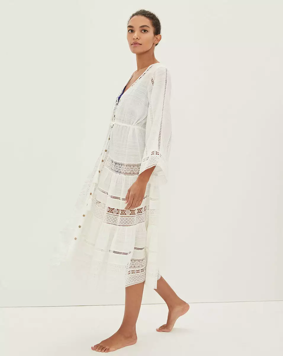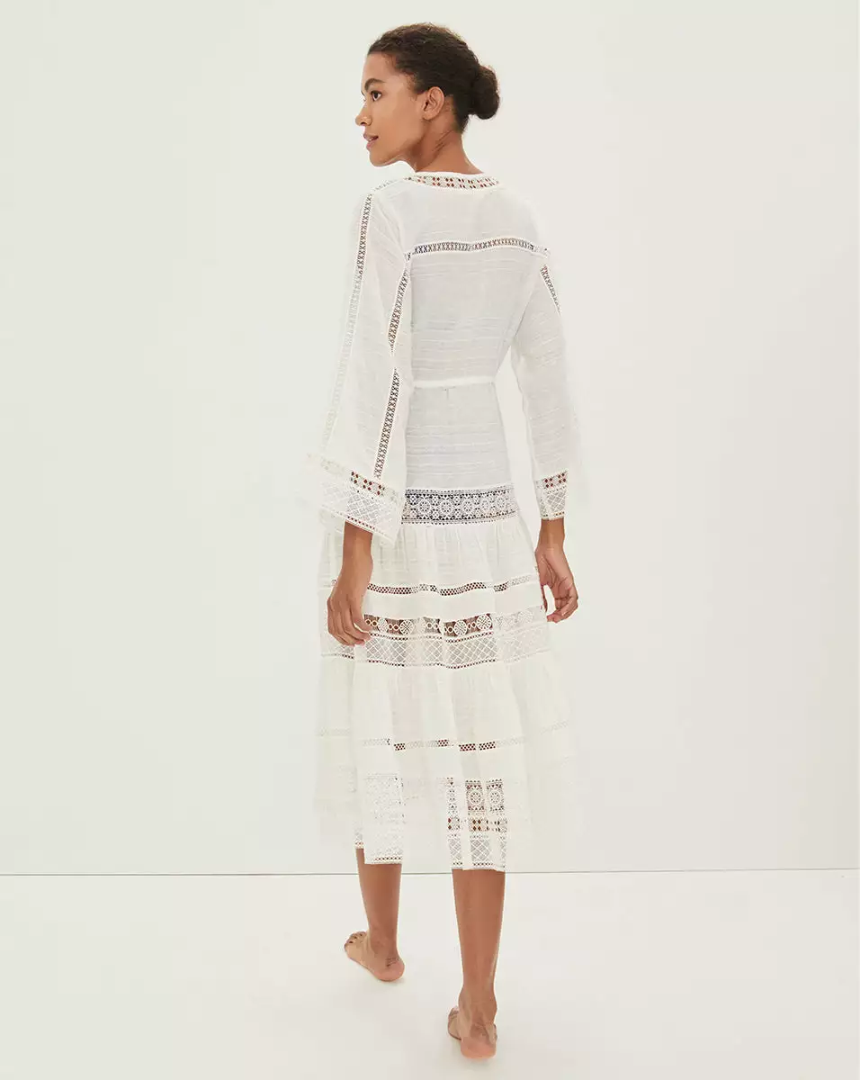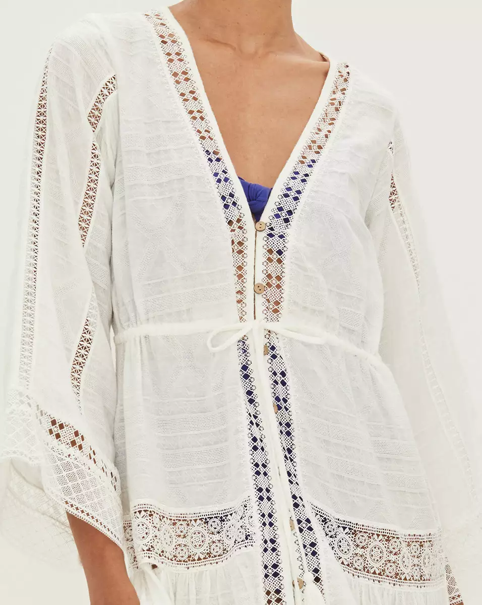 Cut from lightweight 100% cotton, the Minoru is perfect for warm-weather getaways. The beauty is in the details, from the tiered lace panels and trims to the deep-V neckline and voluminous bell sleeves. Universally flattering in a relaxed cut, this also makes for a striking cover-up—throw it on over a swimsuit for an instant poolside outfit.