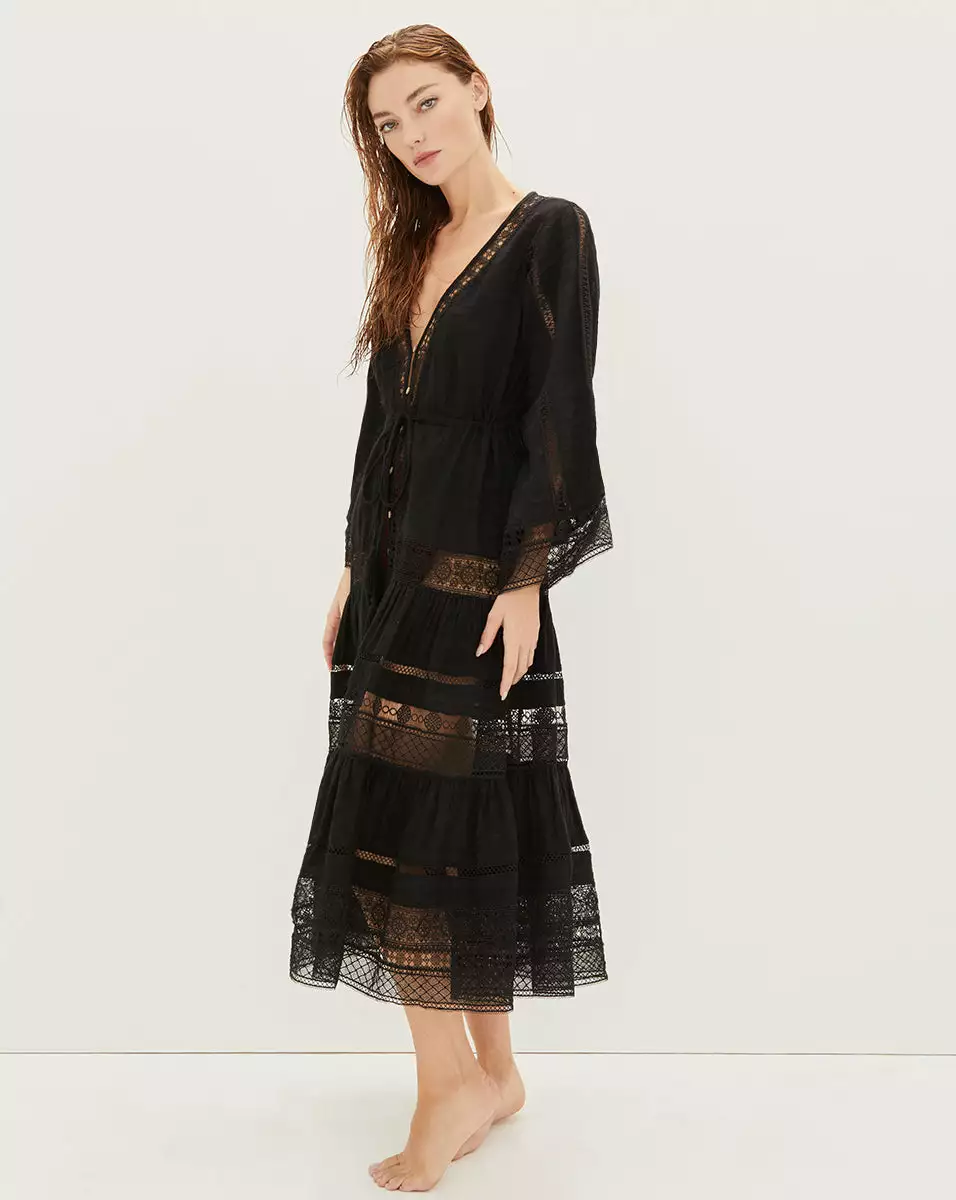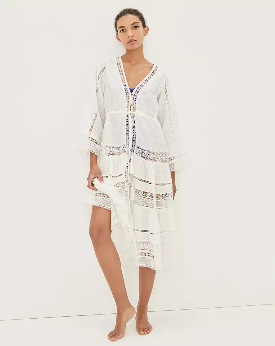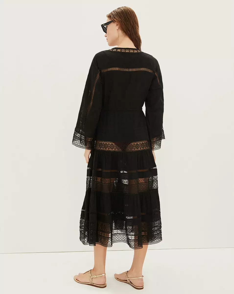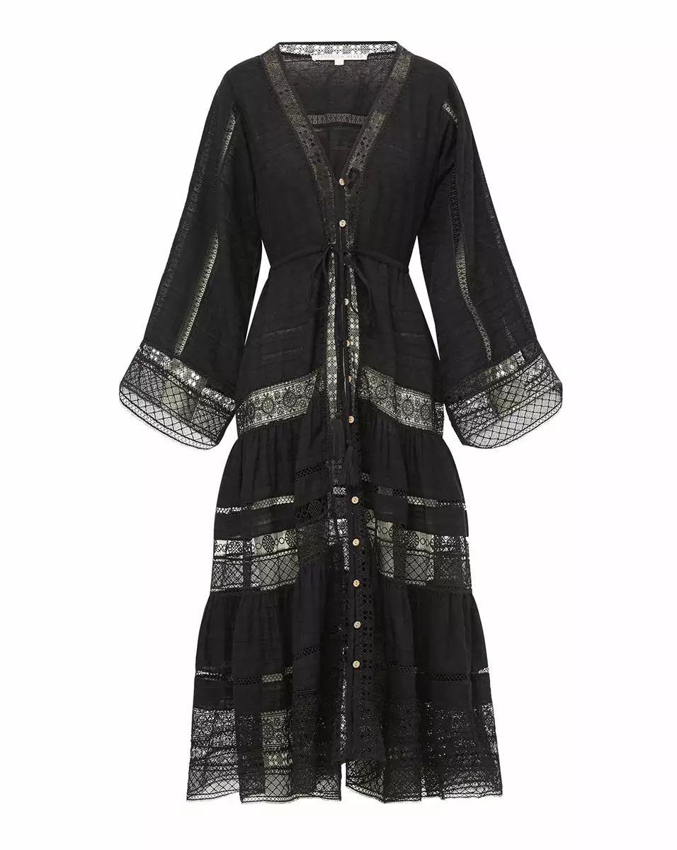 Cut from lightweight 100% cotton, the Minoru is perfect for warm-weather getaways. The beauty is in the details, from the tiered lace panels and trims to the deep-V neckline and voluminous bell sleeves. Universally flattering in a relaxed cut, this also makes for a striking cover-up—throw it on over a swimsuit for an instant poolside outfit.
