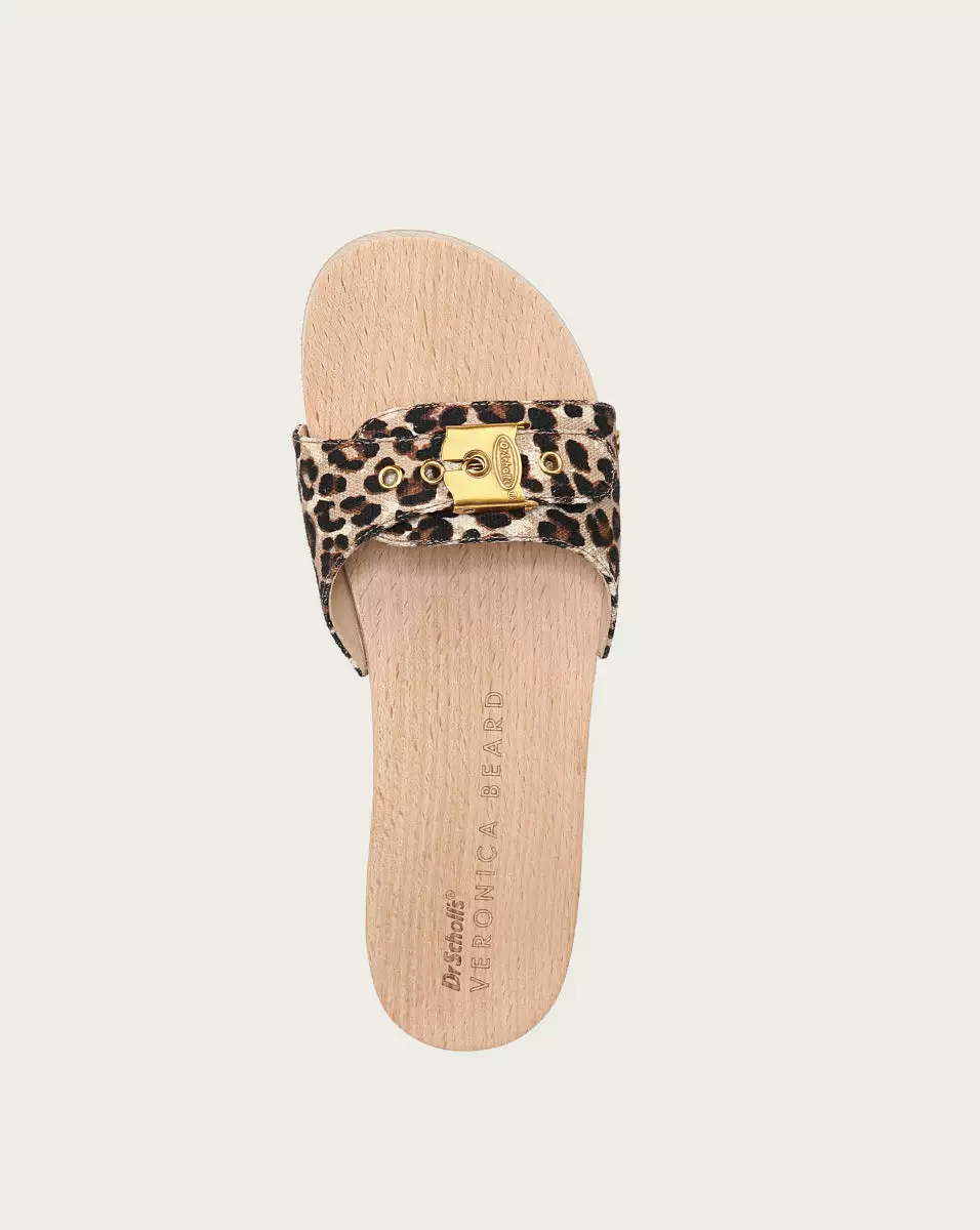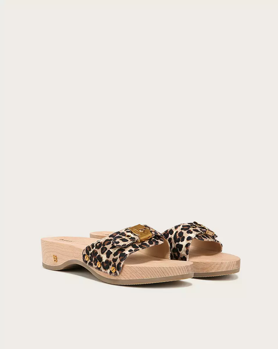 The one and only OG clog sandal by Dr. Scholl’s, made luxe. Consciously crafted with an artisanal wood clog sole in natural beechwood, this slide sandal also features a leopard-printed organic canvas vamp, finished with stud embellishments and Dr. Scholl’s signature metallic buckle. A contoured wood footbed, 1 ½ inch wood platform, and partially manmade rubber sole completes the look and feel of this must-have, retro-inspired style.