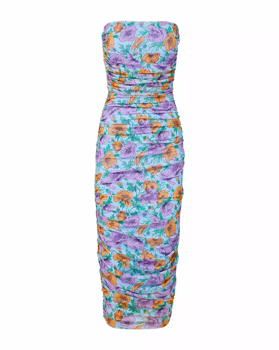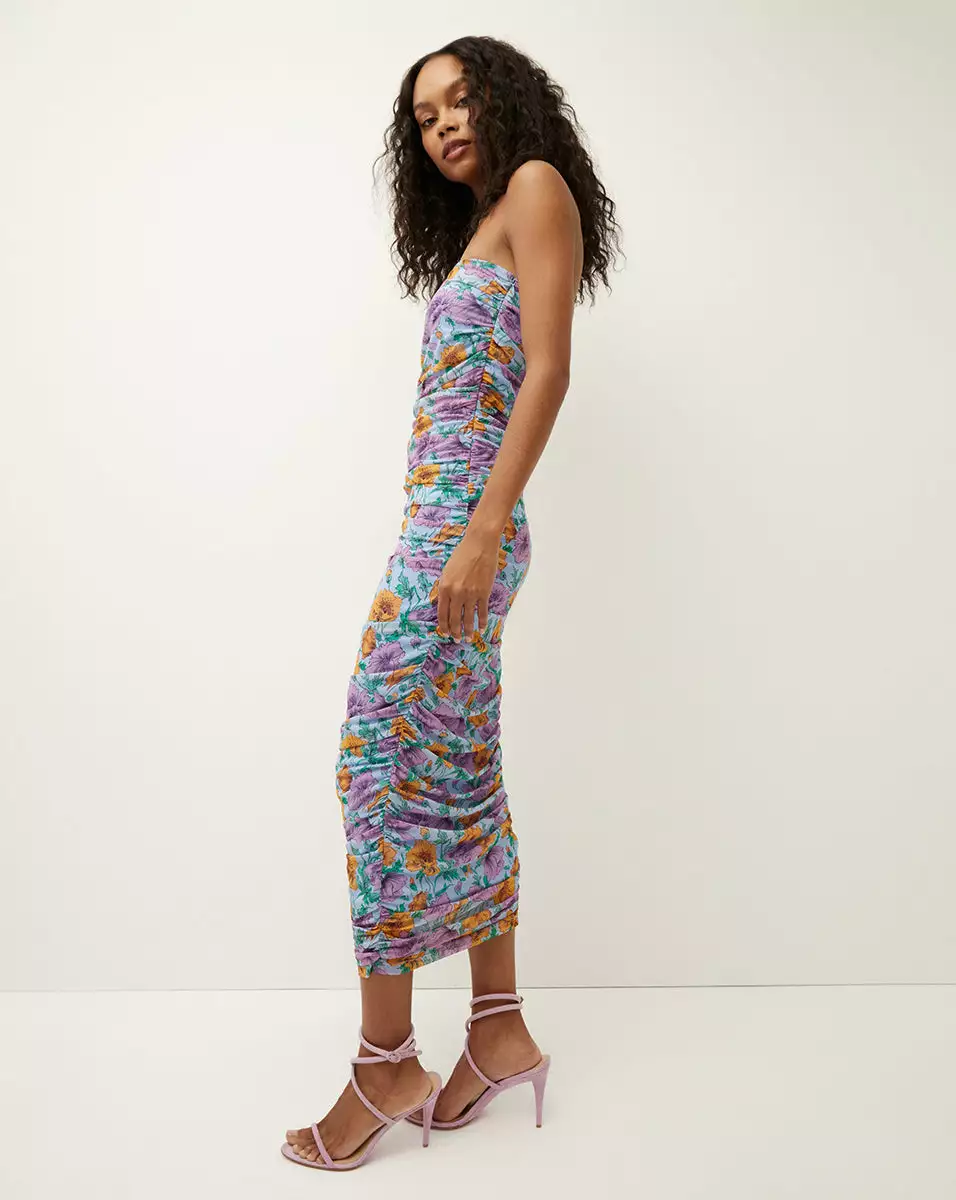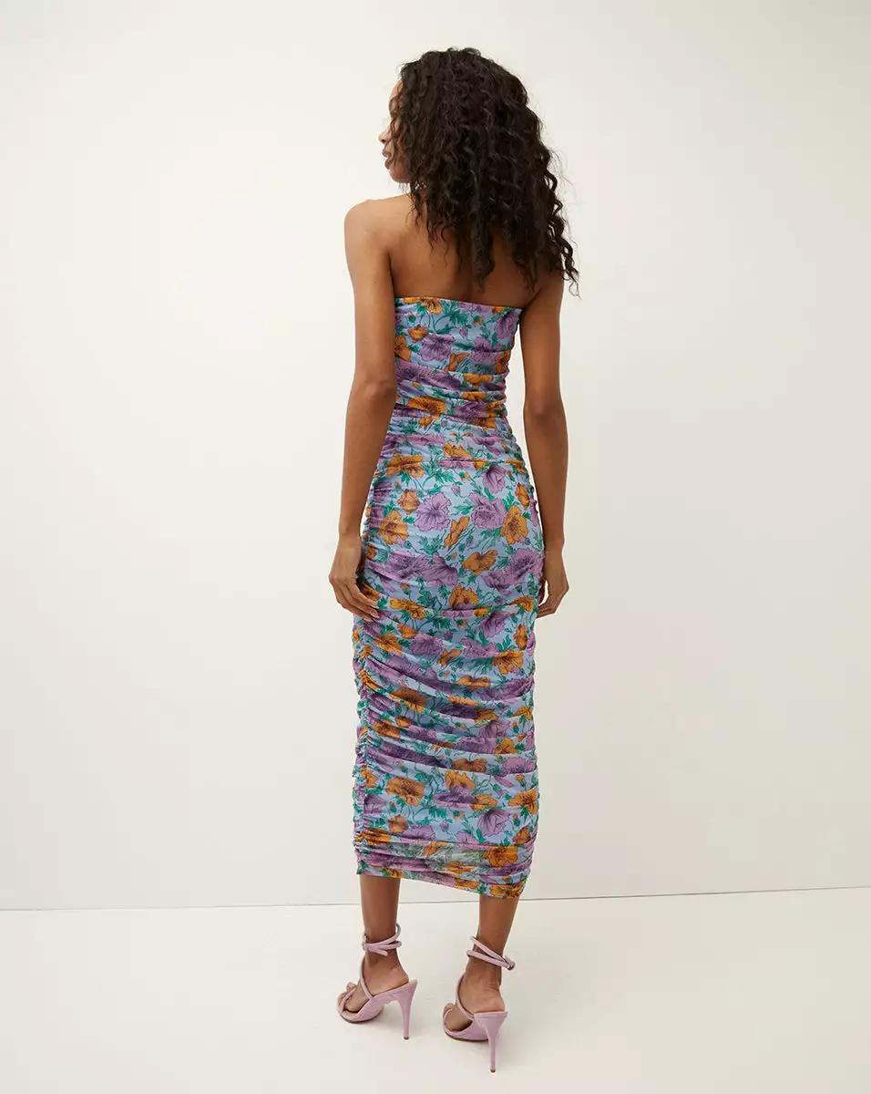 Showcase this feminine floral print with the Quiana dress, made from a chic stretch-mesh. Strategic ruching along the bodice and a form fitting silhouette make this the most flattering dress in your closet. Wear with stiletto heels and your favorite jewelry for your next wedding or date night.