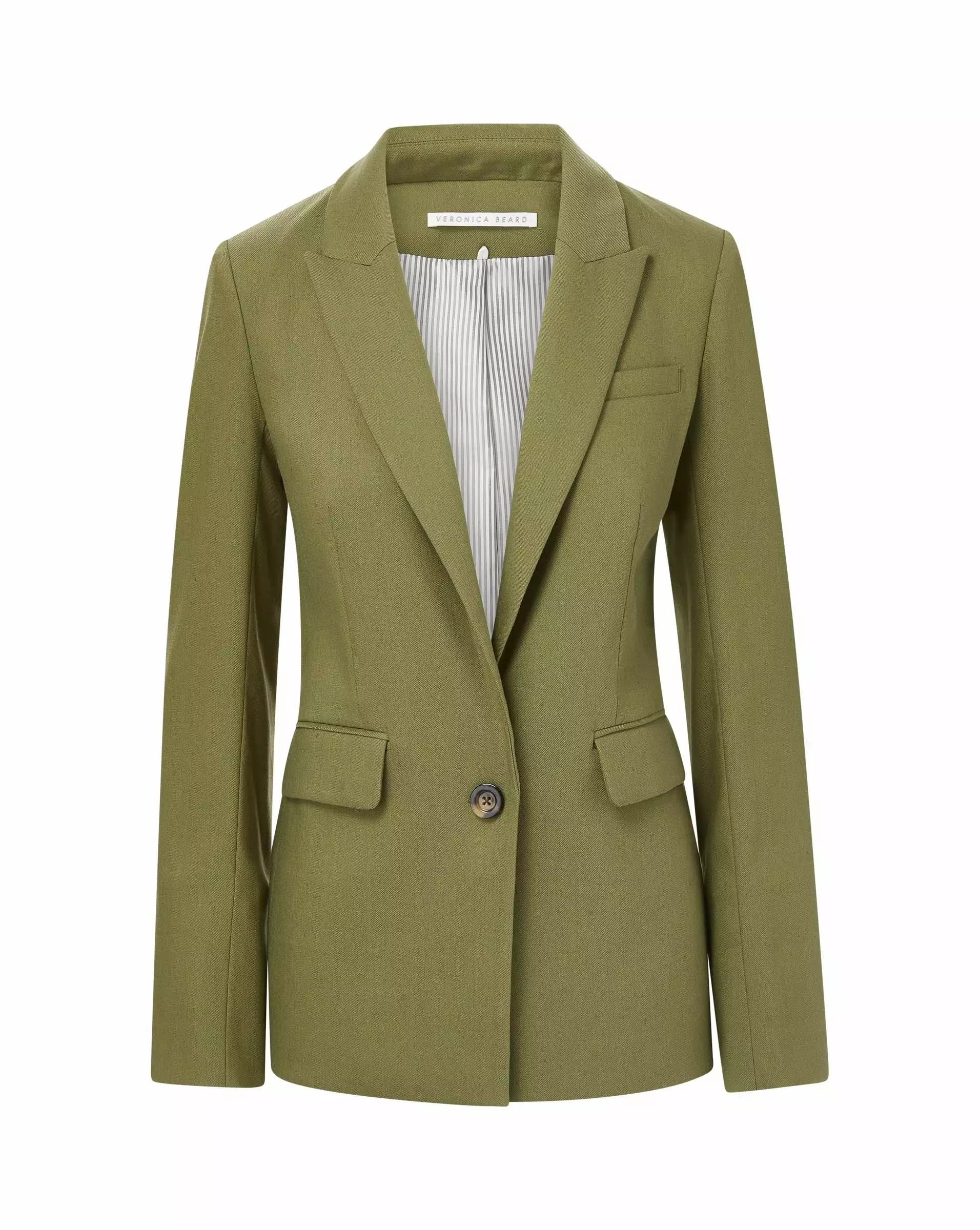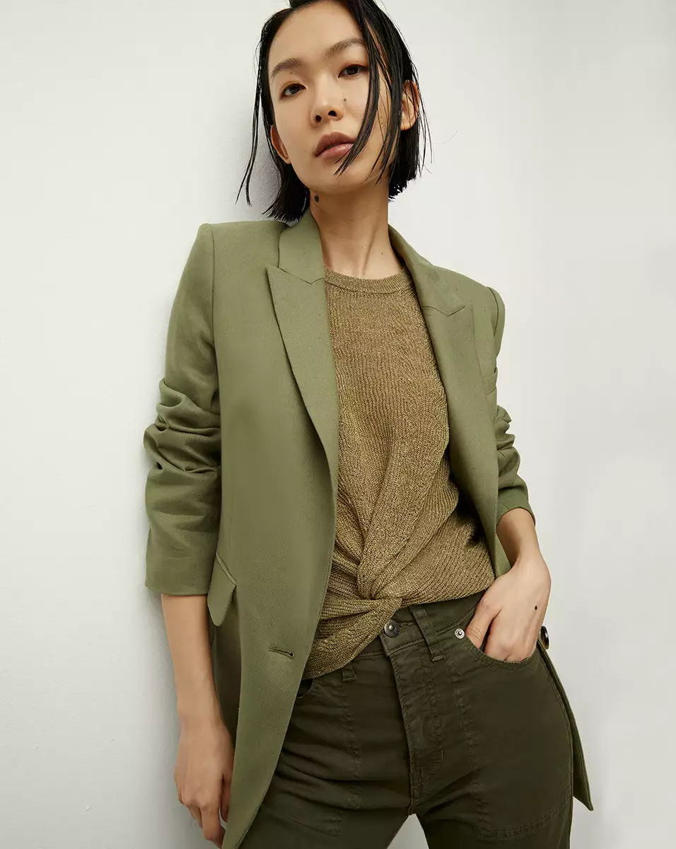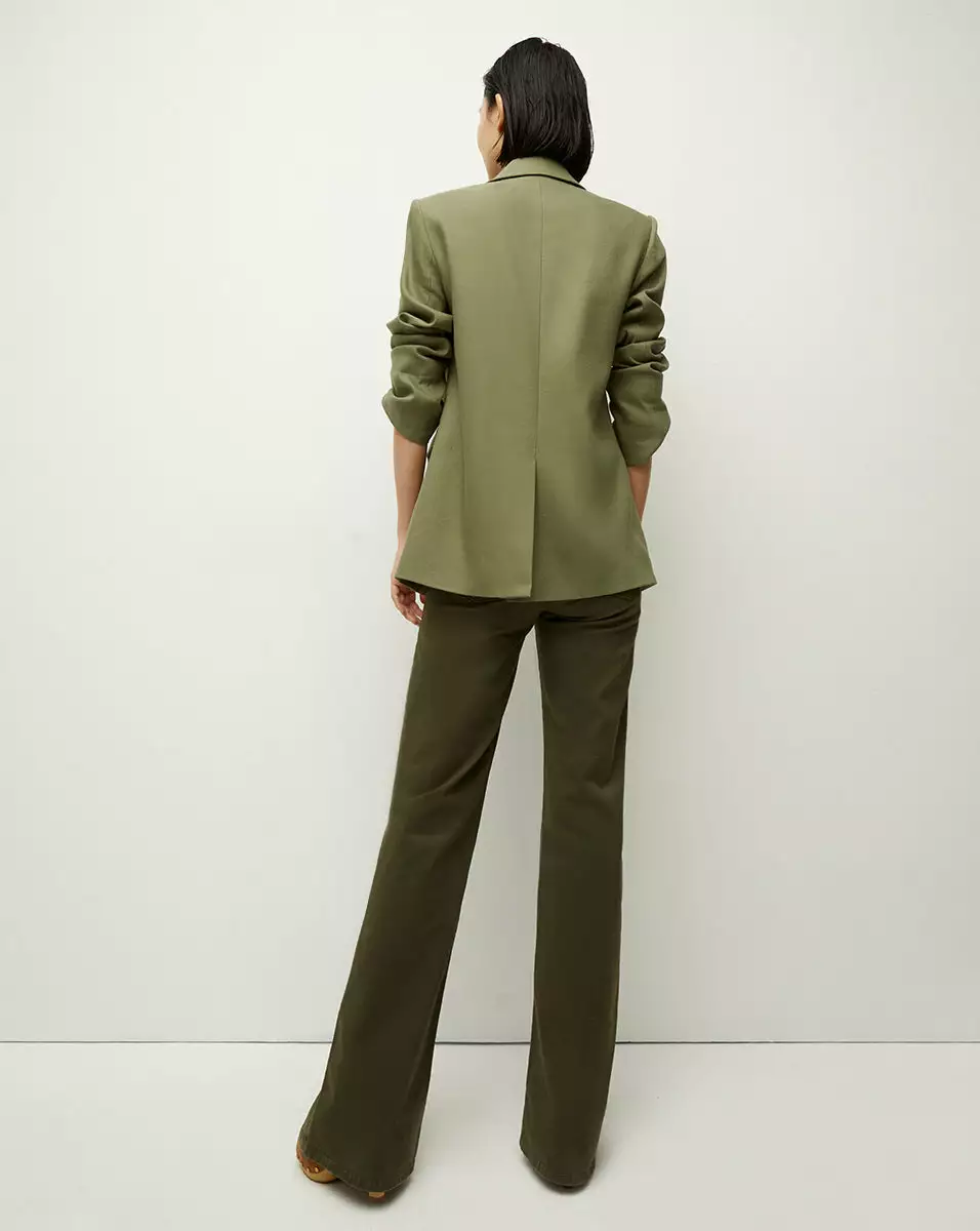 Tailored from a breathable stretch twill-linen blend, the Sevi the ideal layer for summer outfitting. Its lightness is complemented by a neutral army-green hue, single-breasted silhouette and relaxed fit, allowing for major versatility. Layer it over anything for instant polish.