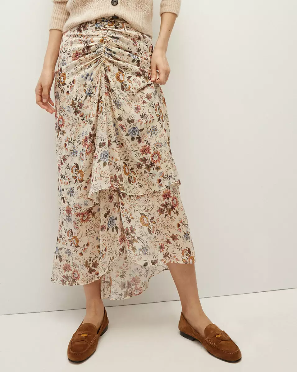 Cut from a floaty silk georgette, the Sira skirt is defined by its center ruching and flattering shape. A tiered, handkerchief hem emphasizes the piece’s airy feel and gives it beautiful movement. Rendered in an all-season floral, Sira can be worn with sandals and a tank now; with a tonal blazer later.