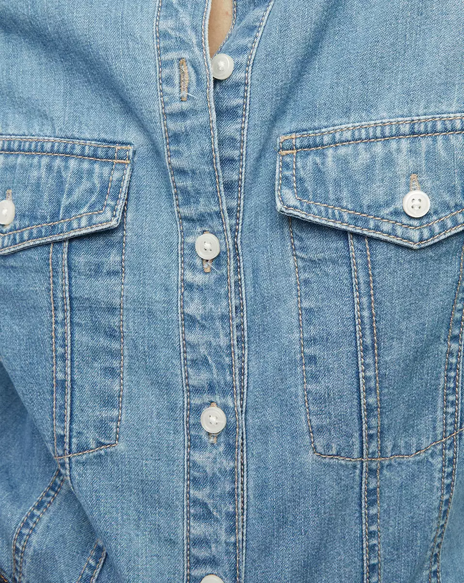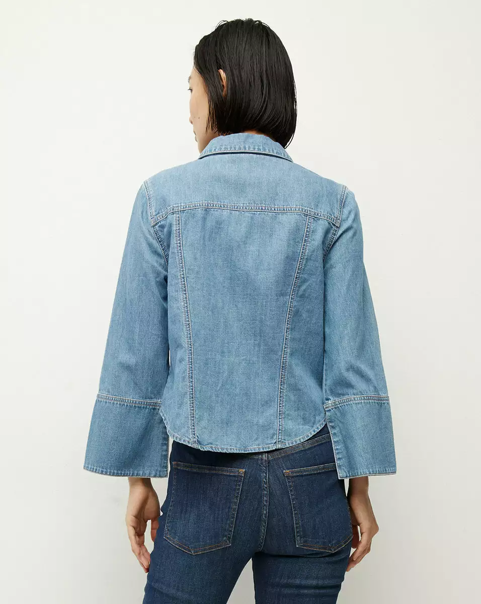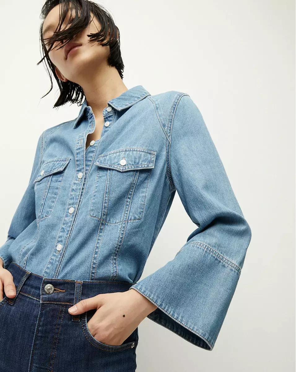 Meet the Tivi, an elevated take on the classic denim shirt. Exceptionally tailored from 100% premium cotton, this slim-fit style features statement bell sleeves as well as darts and curved yokes in the front for a figure-flattering finish. A classic collar and buttoned flap pockets complete the look. Wear with a floral skirt for prairie chic or pair with wide-leg jeans for a cool take on double denim.