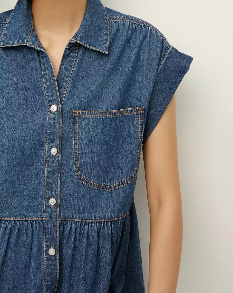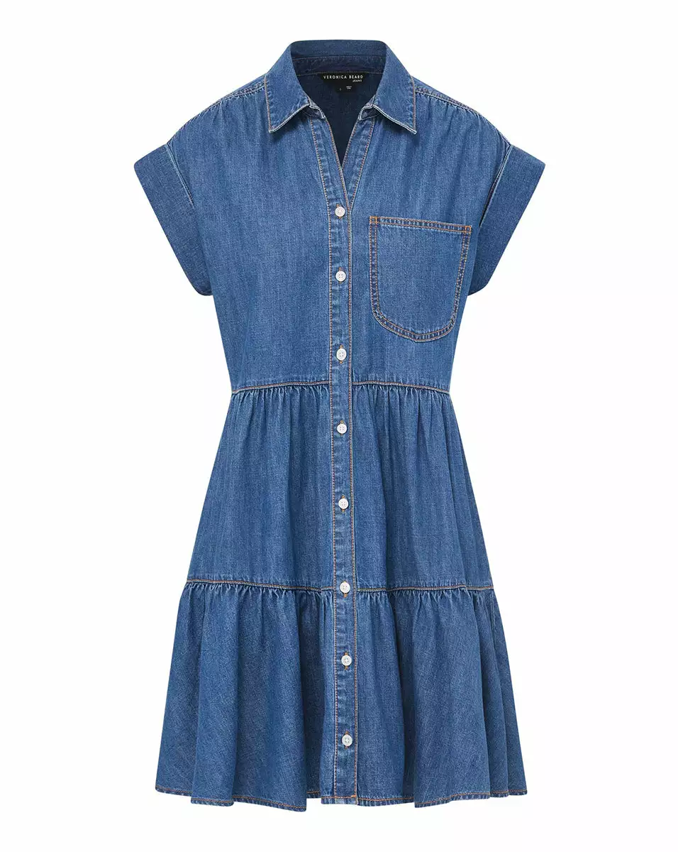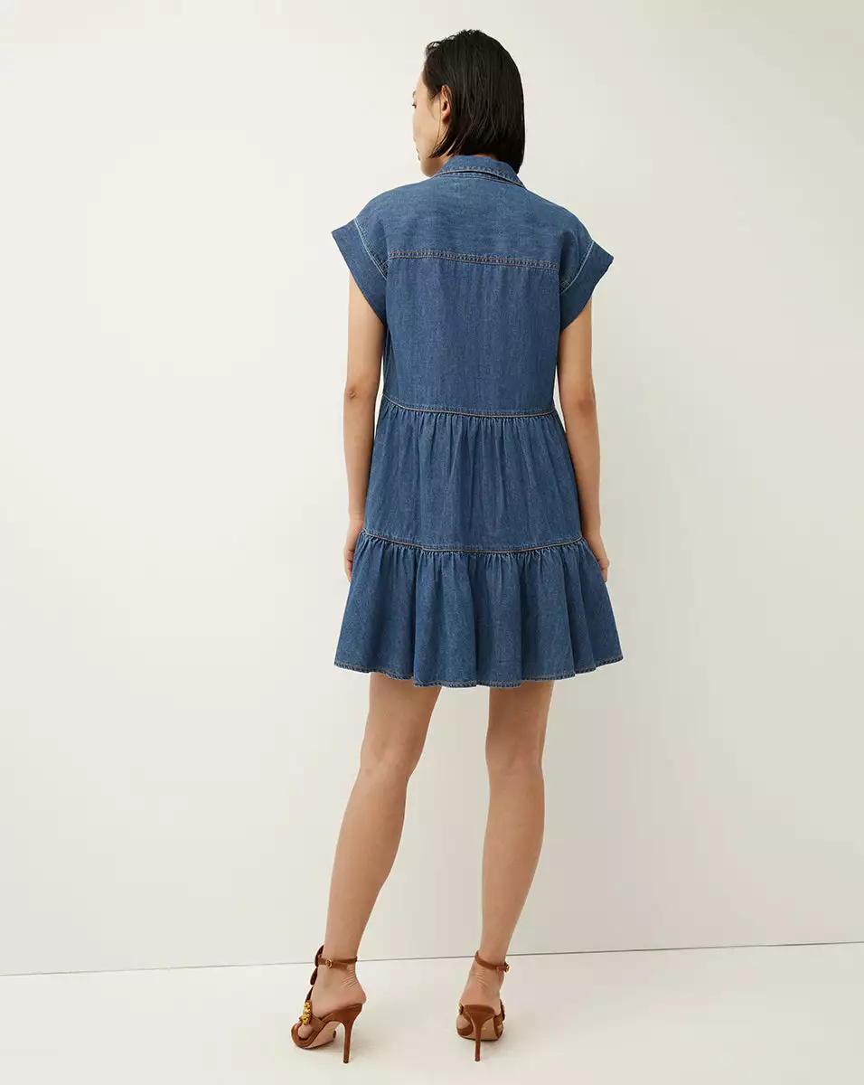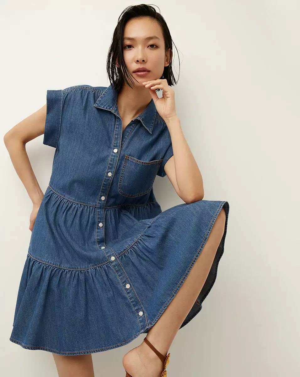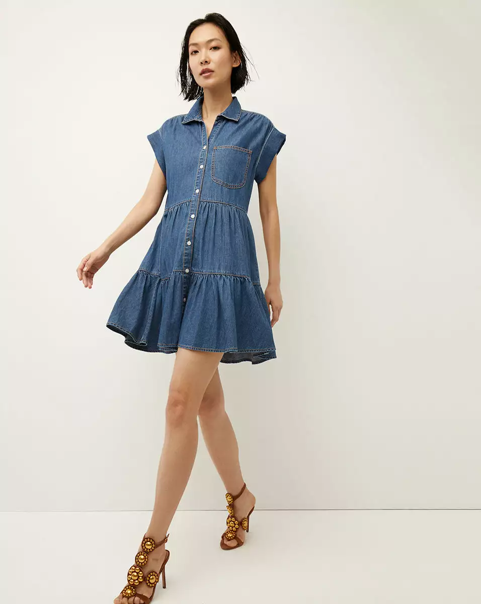 The Trisha dress is a decidedly feminine take on the classic chambray shirtdress. With its capped sleeves, tiered silhouette and flounced hem, this medium-wash denim dress is our idea of the effortless weekend style. Contrast stitching and a patch pocket complete the look. Wear with flat sandals or sneakers during the day; switch to heels for night.