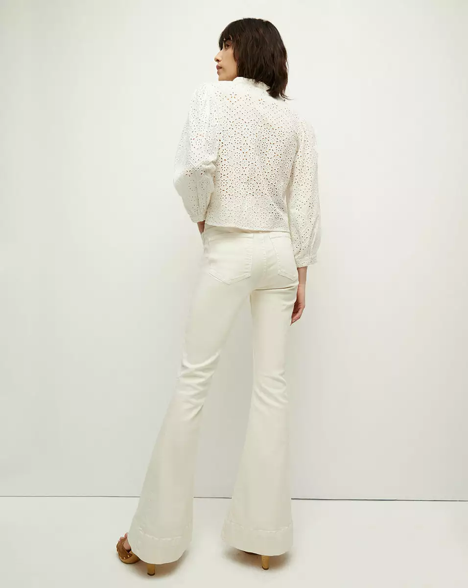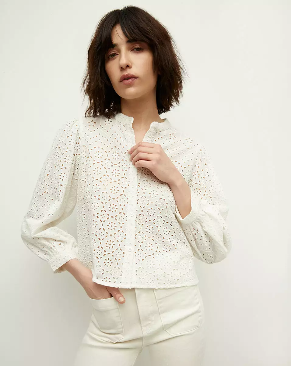 Meet Vitale, your classic button-down, reimagined in a cotton voile eyelet. The relaxed fit and collarless construction give this piece a streamlined look, while puffed, bracelet-length sleeves add feminine polish. Pair with flare denim for the ultimate weekend look.